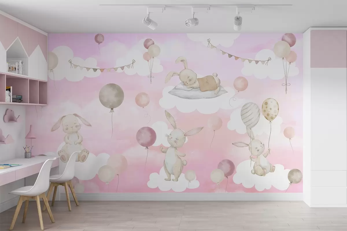 Fototapeten Kaninchen mit Luftballons auf Wolken N° w04337v1