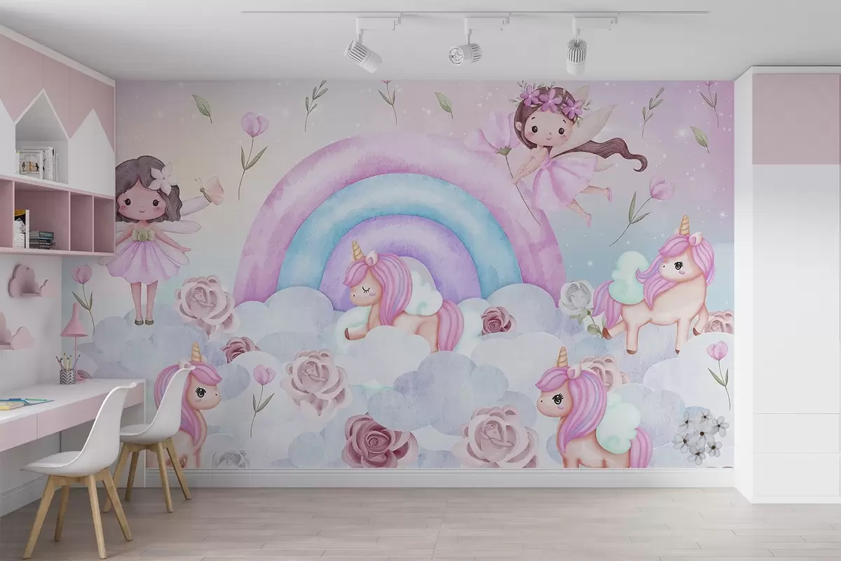 Fototapeten Feen und Einhörner zwischen Wolken und Regenbögen N° w04371