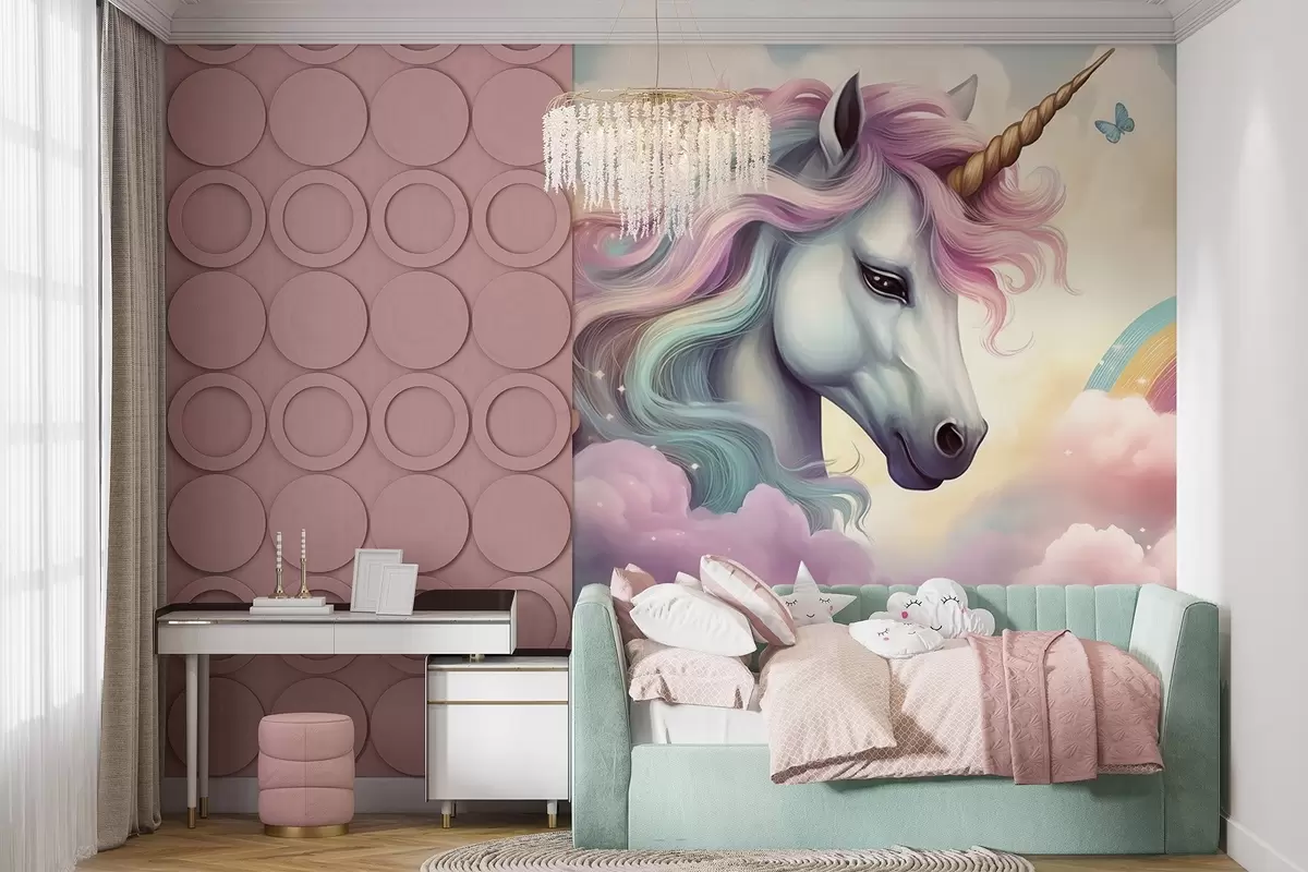 Fototapeten Einhorn in einem bewölkten Himmel mit einem Regenbogen N° w04372