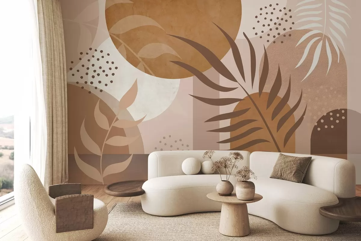 Fototapeten Zeitgenössische Abstraktion mit Pflanzen in Braun- und Beigetönen N° w04497