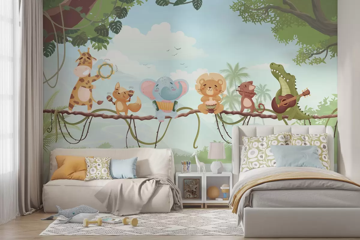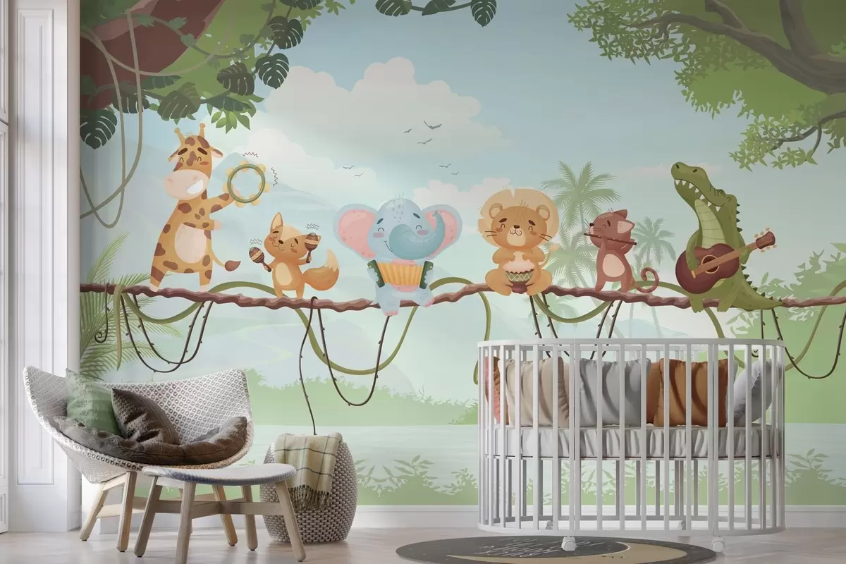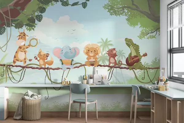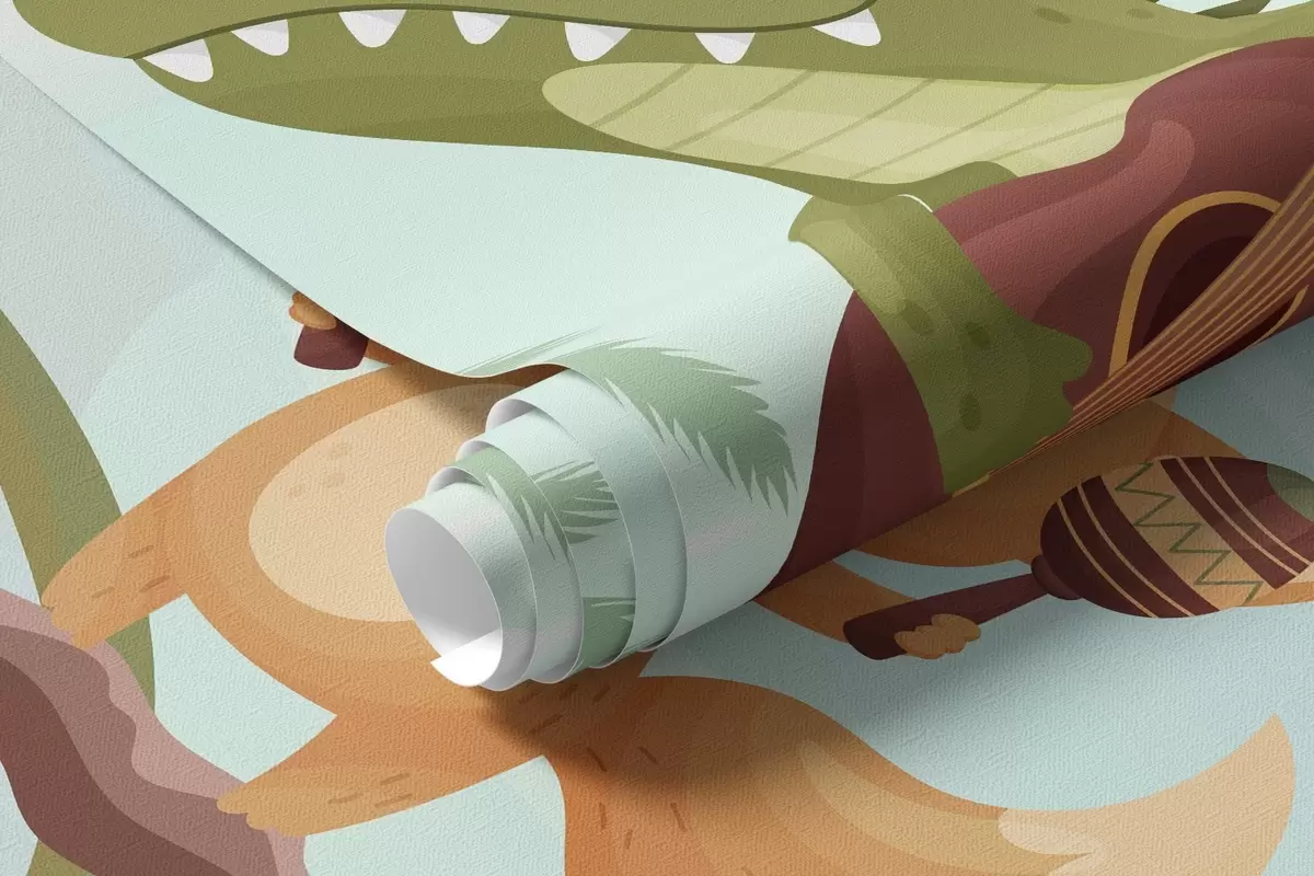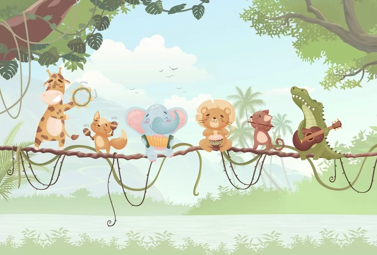 Fototapeten Tiere mit Musikinstrumenten vor einer tropischen Landschaft N° w04505