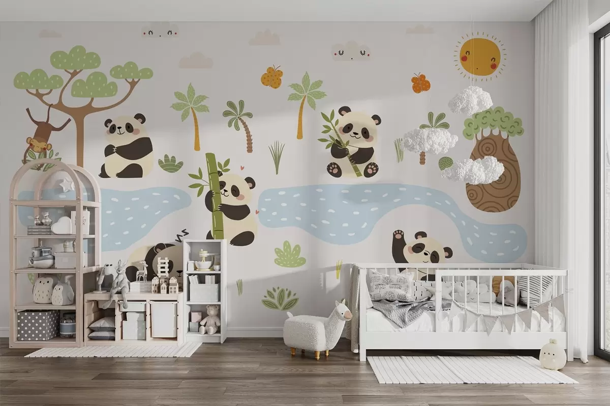 Fototapeten Fröhliche Pandas am Fluss N° w04541