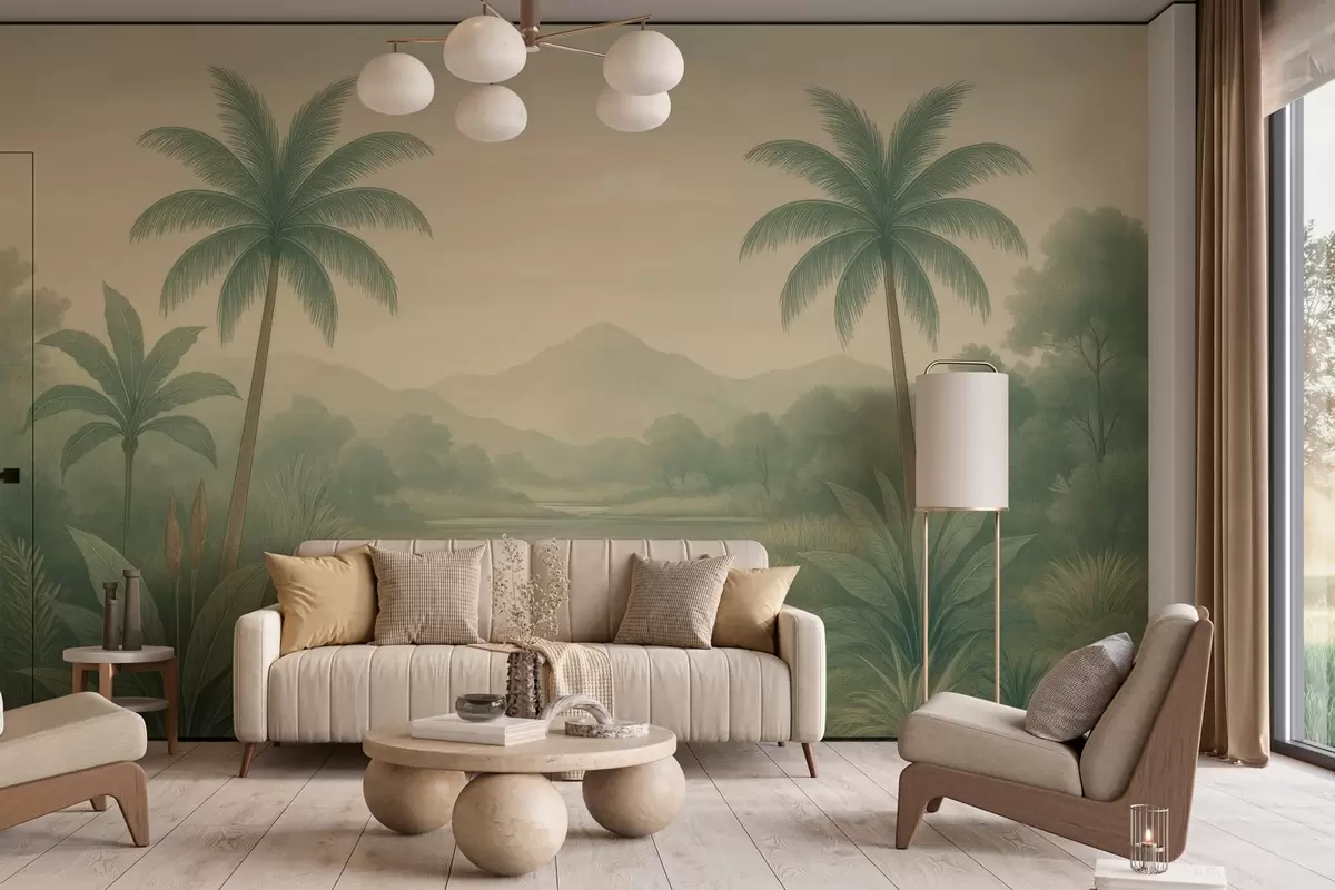 Fototapeten tropische Landschaft mit Palmen und einem Fluss N° w04623