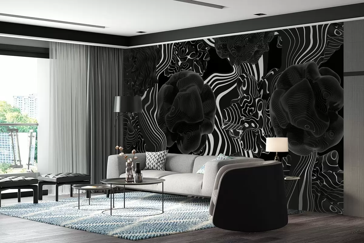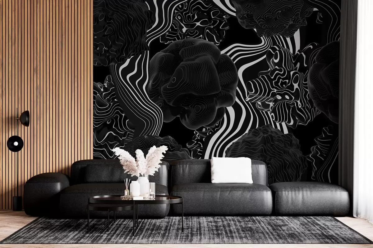 Fototapeten Abstrakte organische Formen im 3D-Stil in Schwarztönen mit weißen Streifen N° w04628