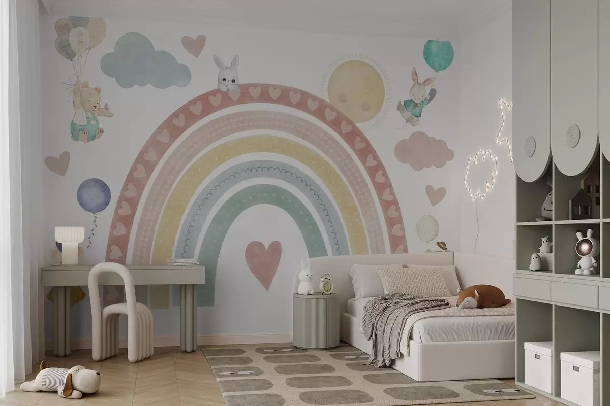 Fototapeten Pastellfarbener Regenbogen mit Herzen, Tieren und Luftballons N° w04681