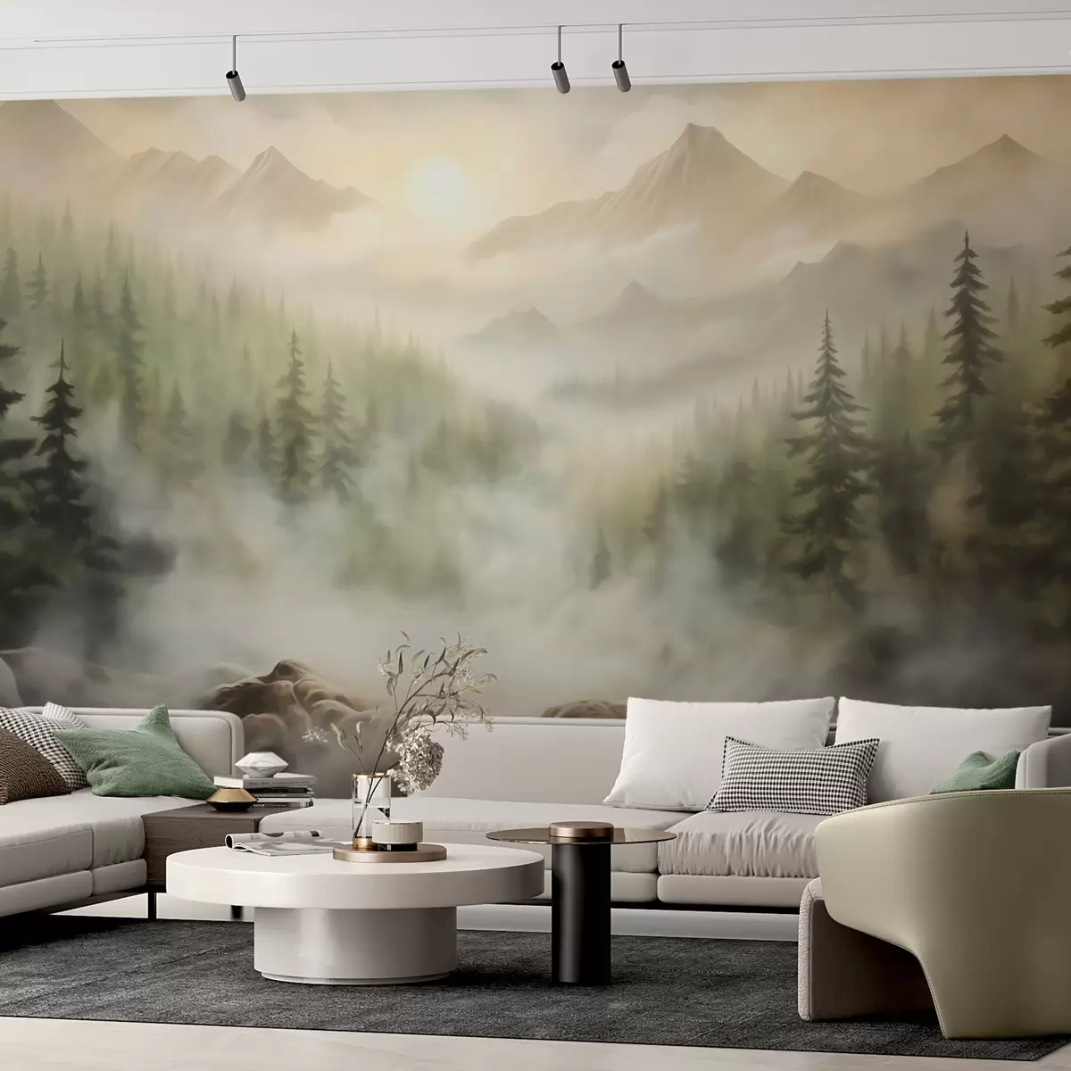 Fototapeten Wald im Nebel vor dem Hintergrund der Berge N° w04730