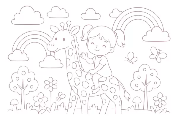 Fototapeten schwarz-Weiß-Zeichnung eines Mädchens auf einer Giraffe im Stil eines Malbuchs für Kinder N° w04753