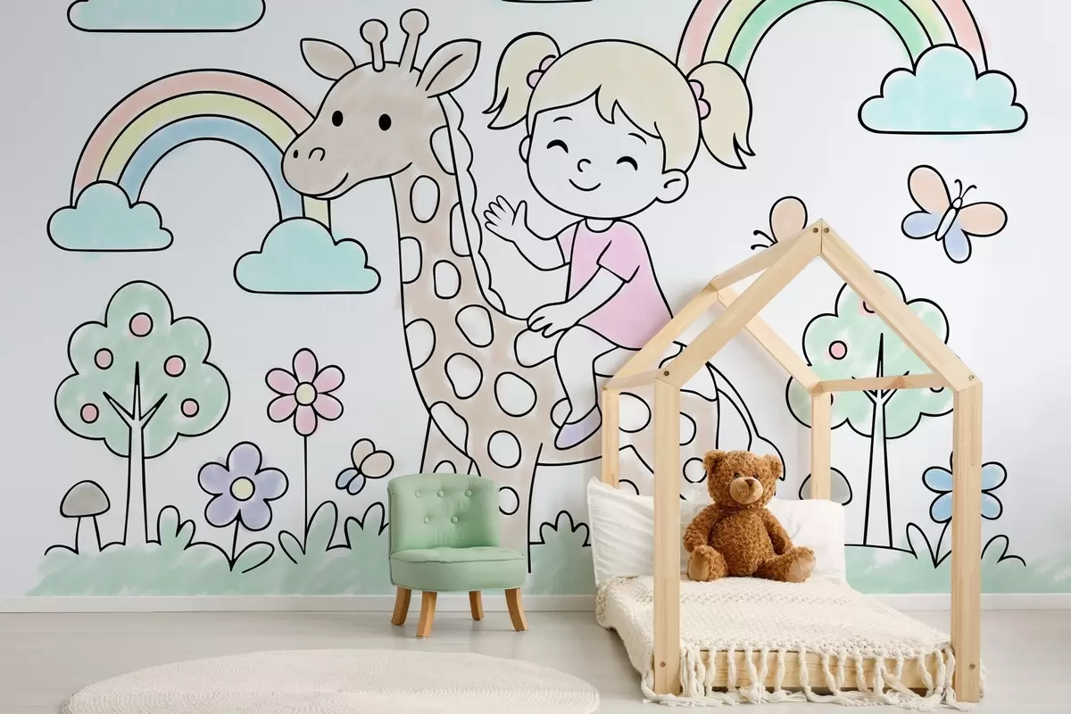 Fototapeten mädchen auf einer Giraffe im Stil eines Malbuchs für Kinder N° w04755
