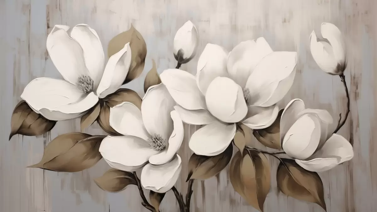 Fototapeten Große Magnolienblüten mit taupefarbenen Blättern vor gebürstetem Hintergrund N° w04785