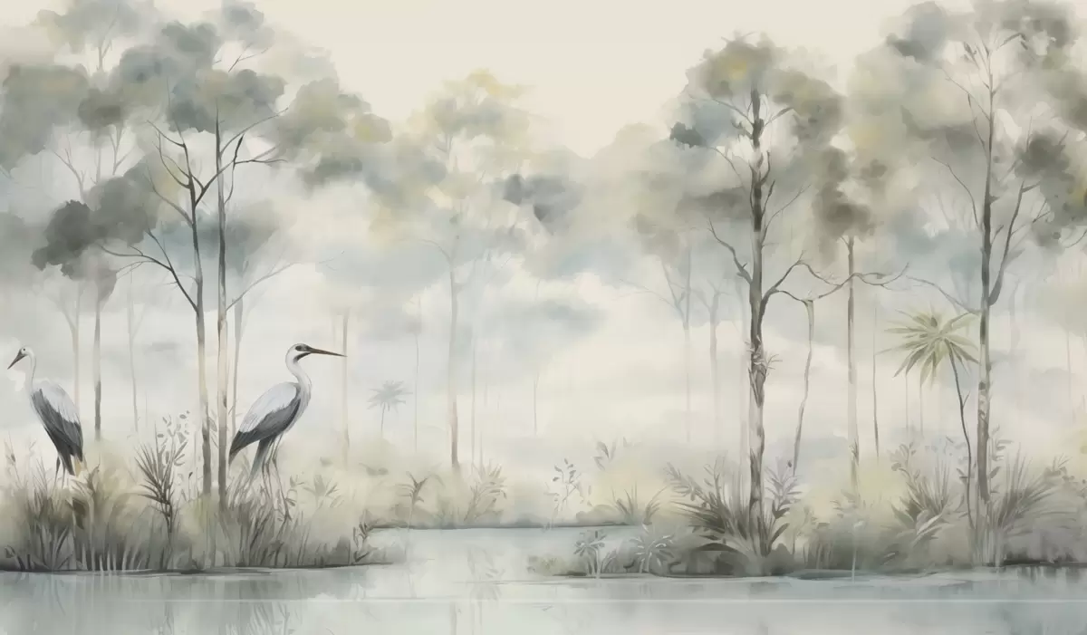 Fototapeten Nebelverhangener Wald am Wasser mit Reihern, sanfte, kühle Farbpalette N° w04788