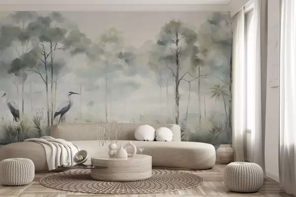 Fototapeten Nebelverhangener Wald am Wasser mit Reihern, sanfte, kühle Farbpalette N° w04788