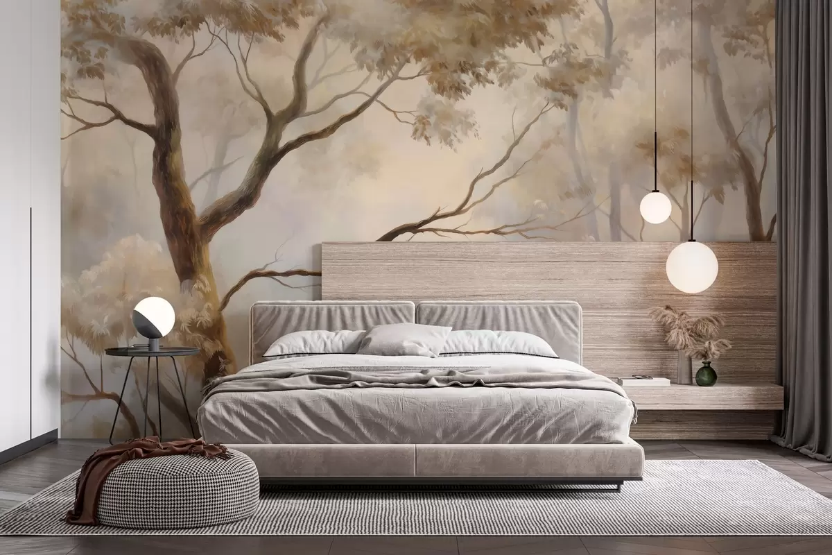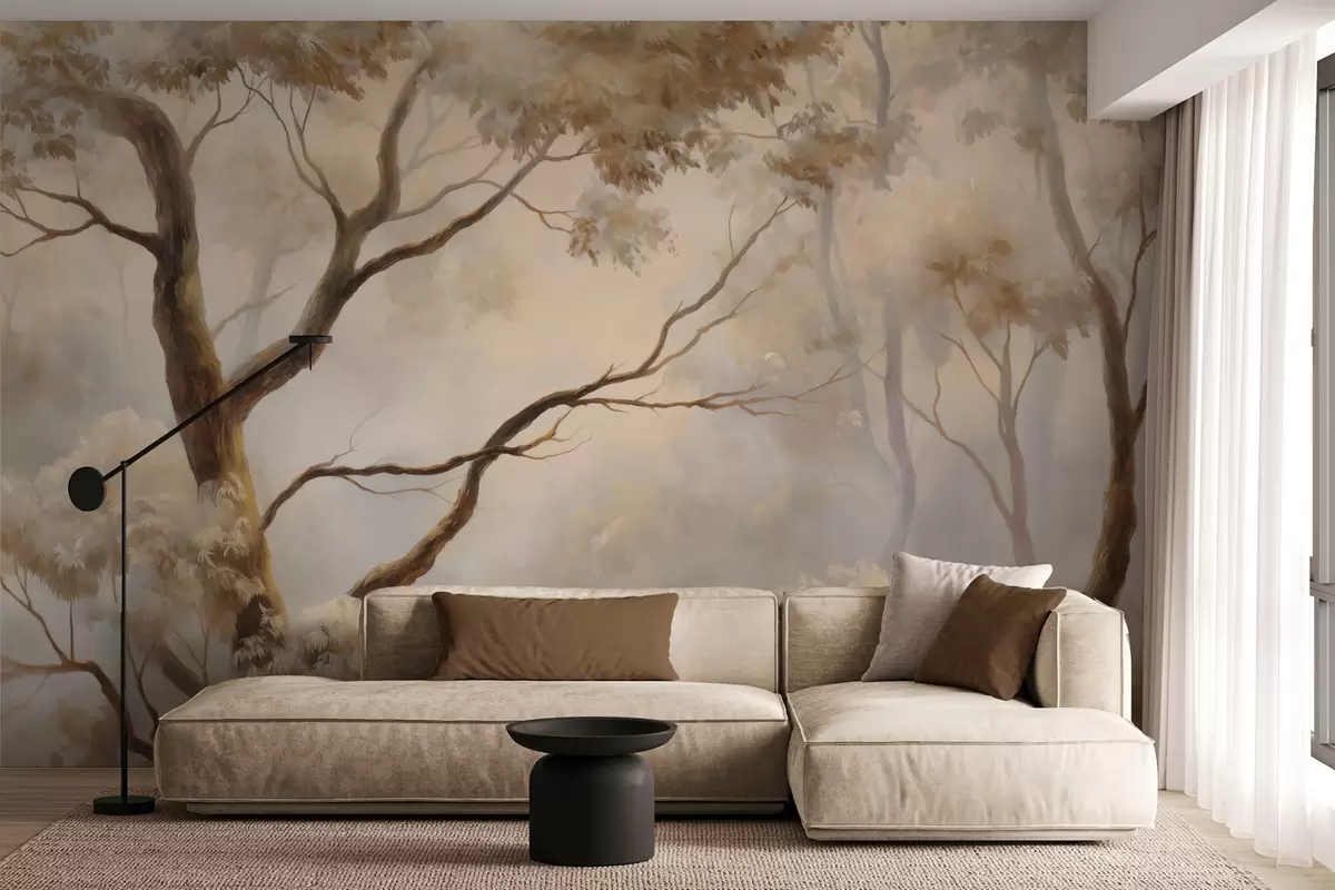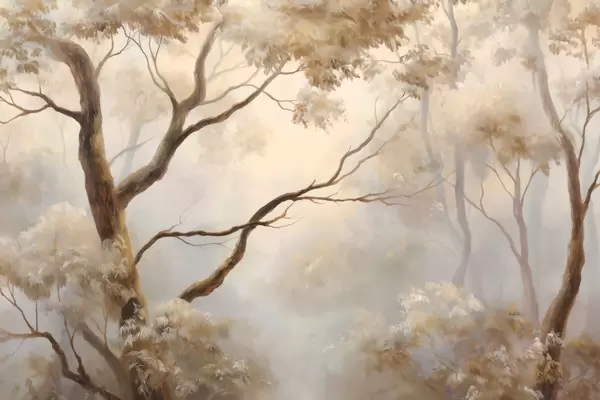 Fototapeten Der Wald im leichten Morgennebel. Ein zartes, atmosphärisches Gemälde im Stil einer künstlerischen Landschaft. N° w04817