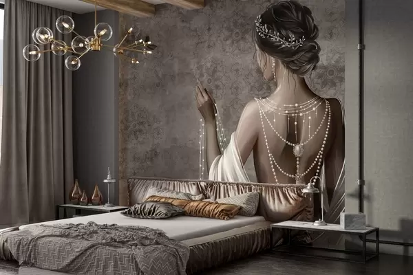Fototapeten Frau von hinten gesehen mit Perlen, grauer Hintergrund mit Steinmuster N° w04854