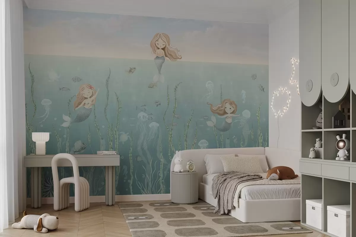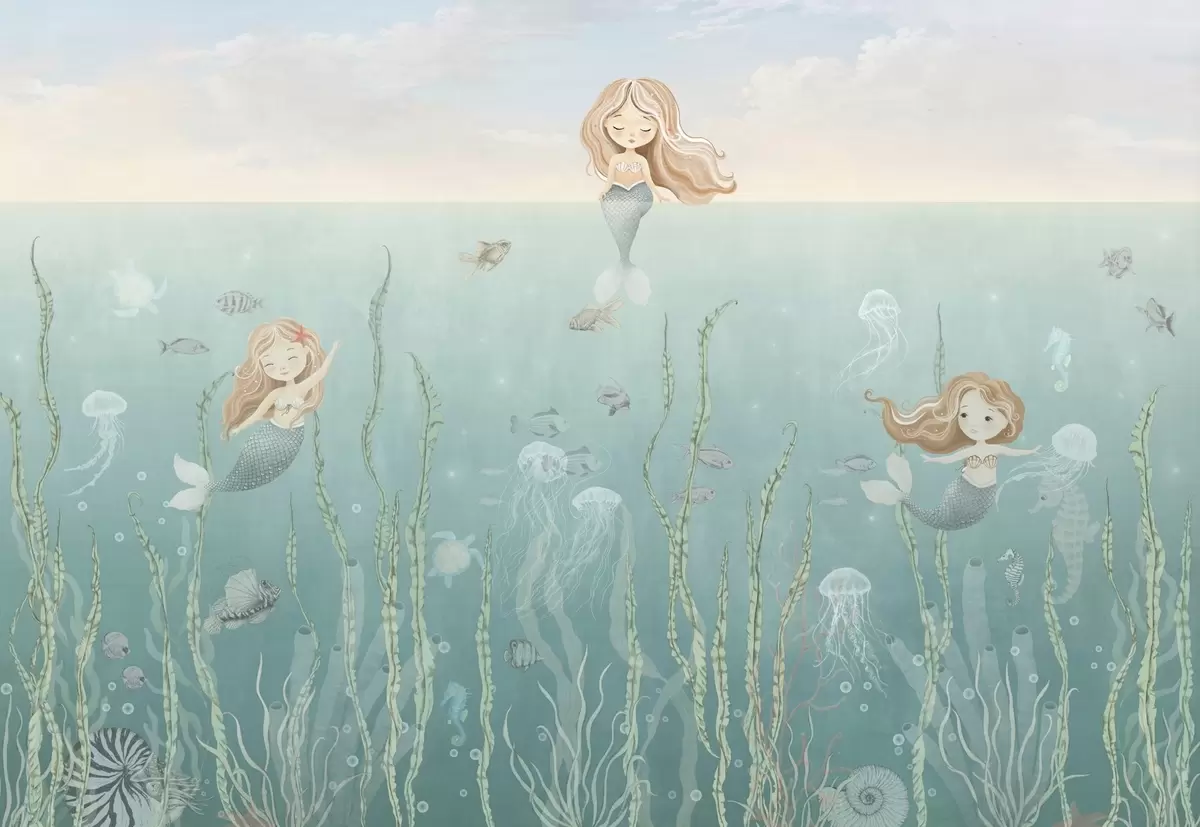 Fototapeten Verspielte Meerjungfrauen unter Wasser mit Seetang, Quallen und Fischen N° w04860