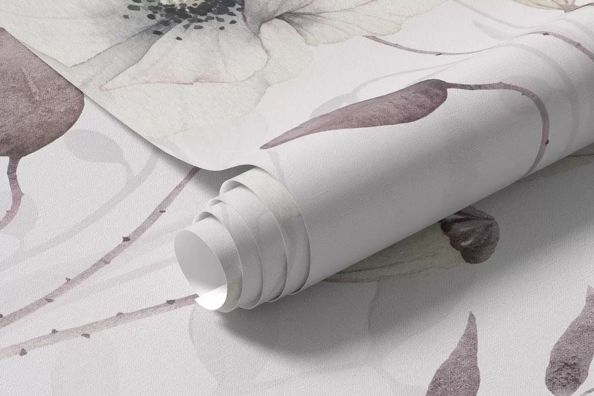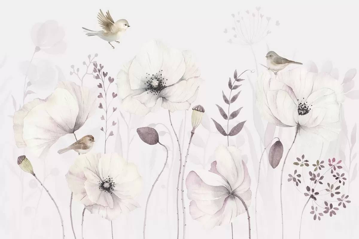 Fototapeten Aquarell-Mohnblumen mit kleinen Vögeln in zartem Mauve N° w04861
