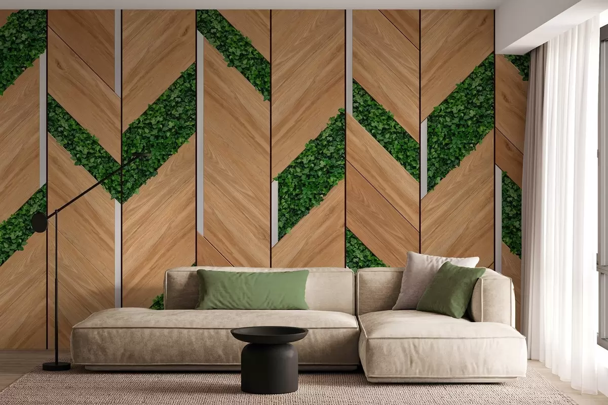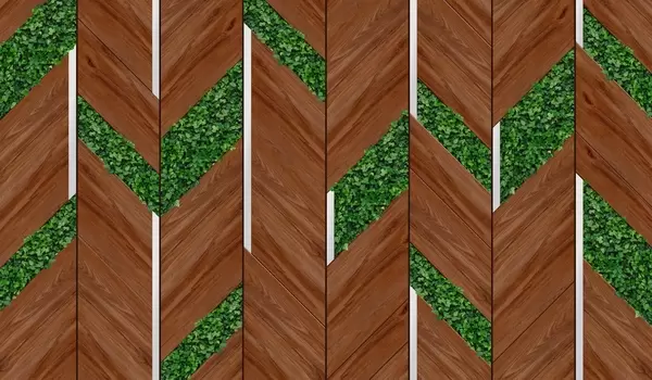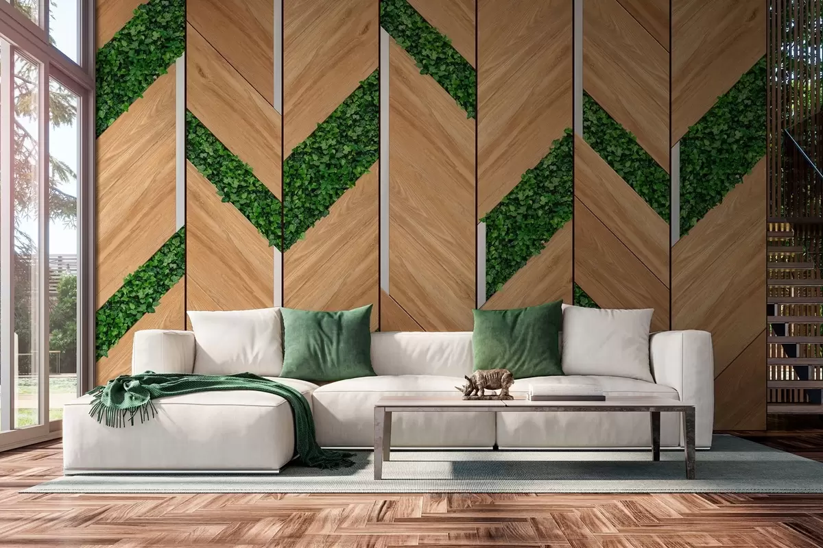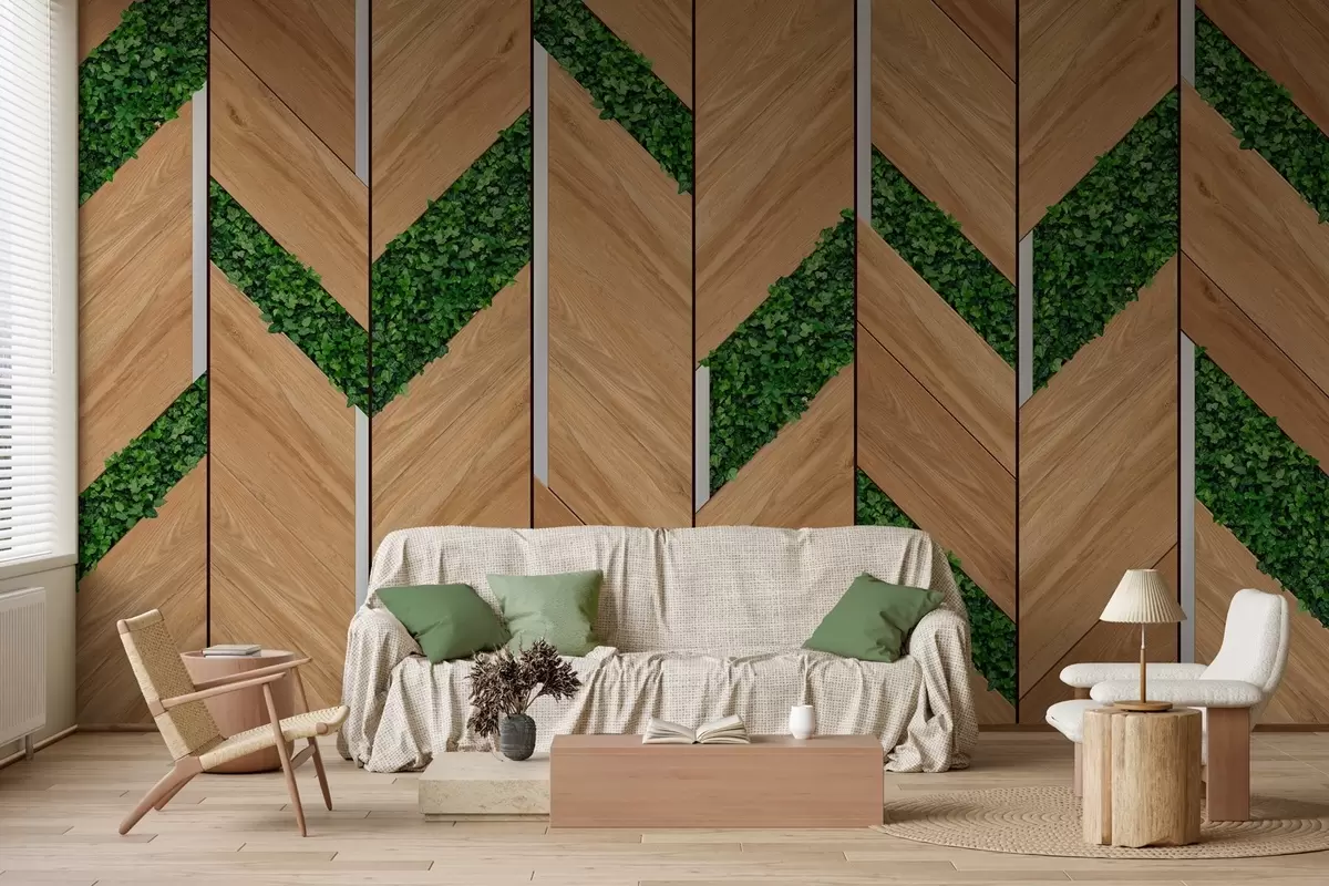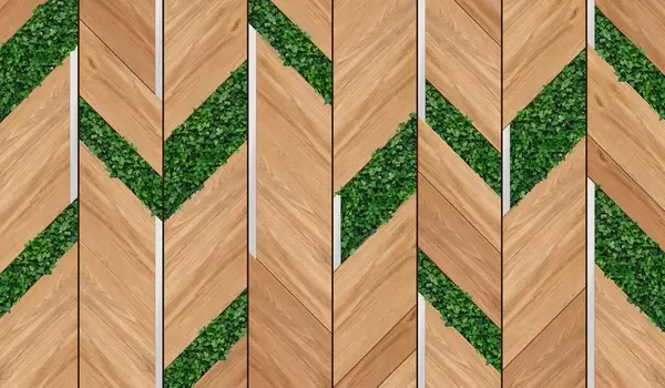 Fototapeten Imitation von hellen Holzpaneelen mit Pflanzeneinsätzen N° w04875