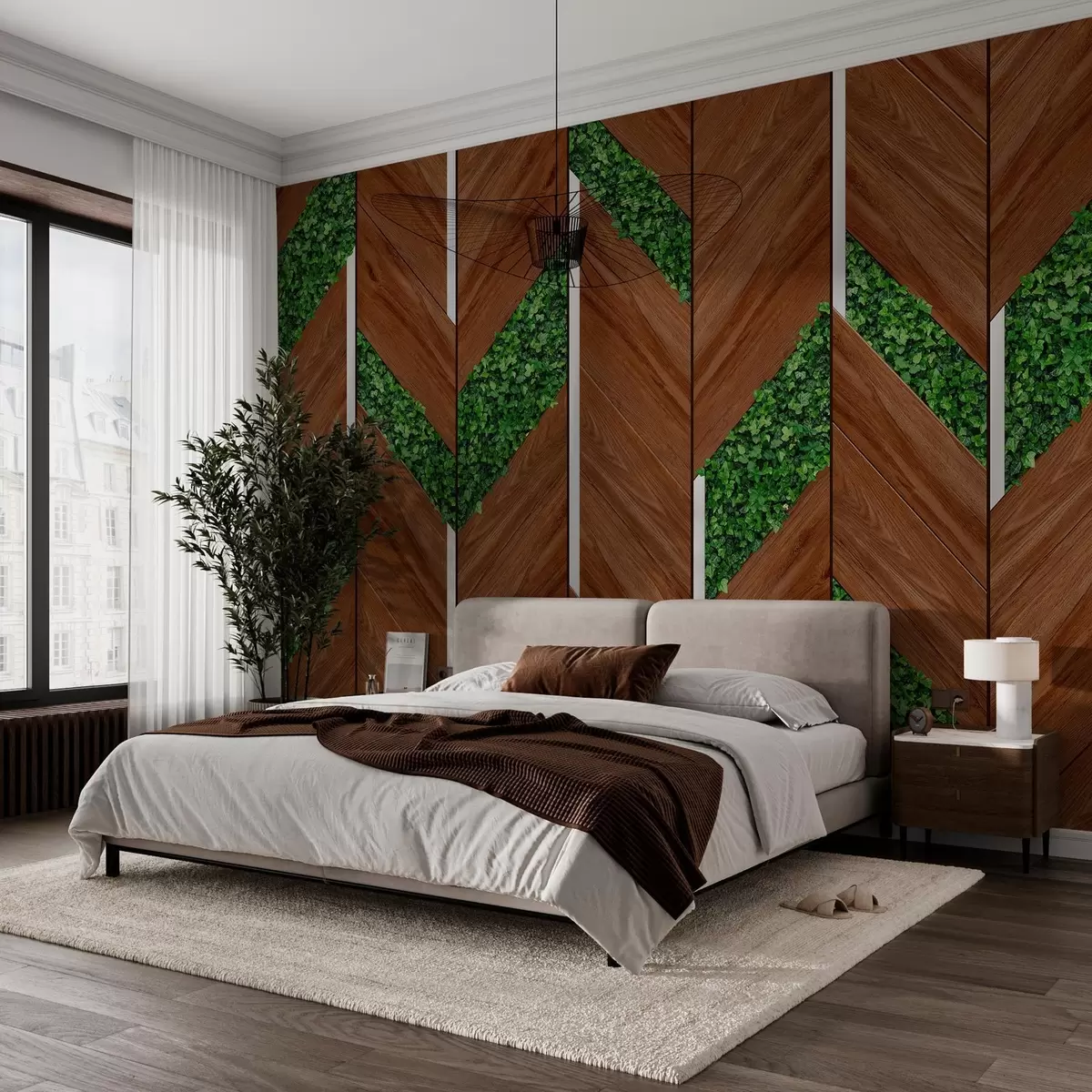 Fototapeten Imitation von dunklen Holzpaneelen mit Pflanzeneinsätzen N° w04875v1
