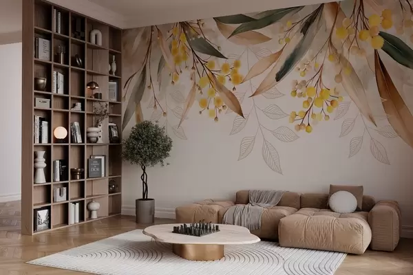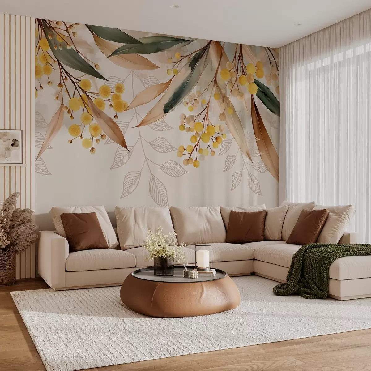 Fototapeten Blüten und Blätter der Mimose, die im Aquarellstil von oben herabfallen N° w04880