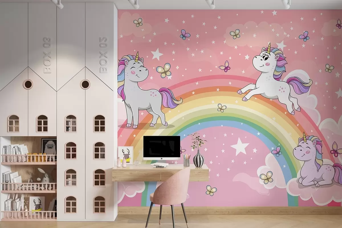 Fototapeten Einhörner auf einem Regenbogen N° w04930