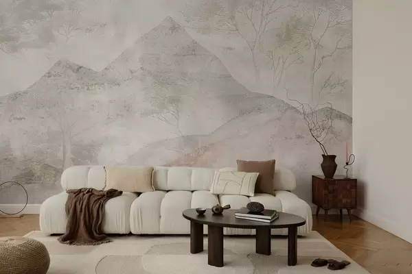 Fototapeten Sanfte pastellfarbene Berge und Bäume im leichten Nebel N° w04954