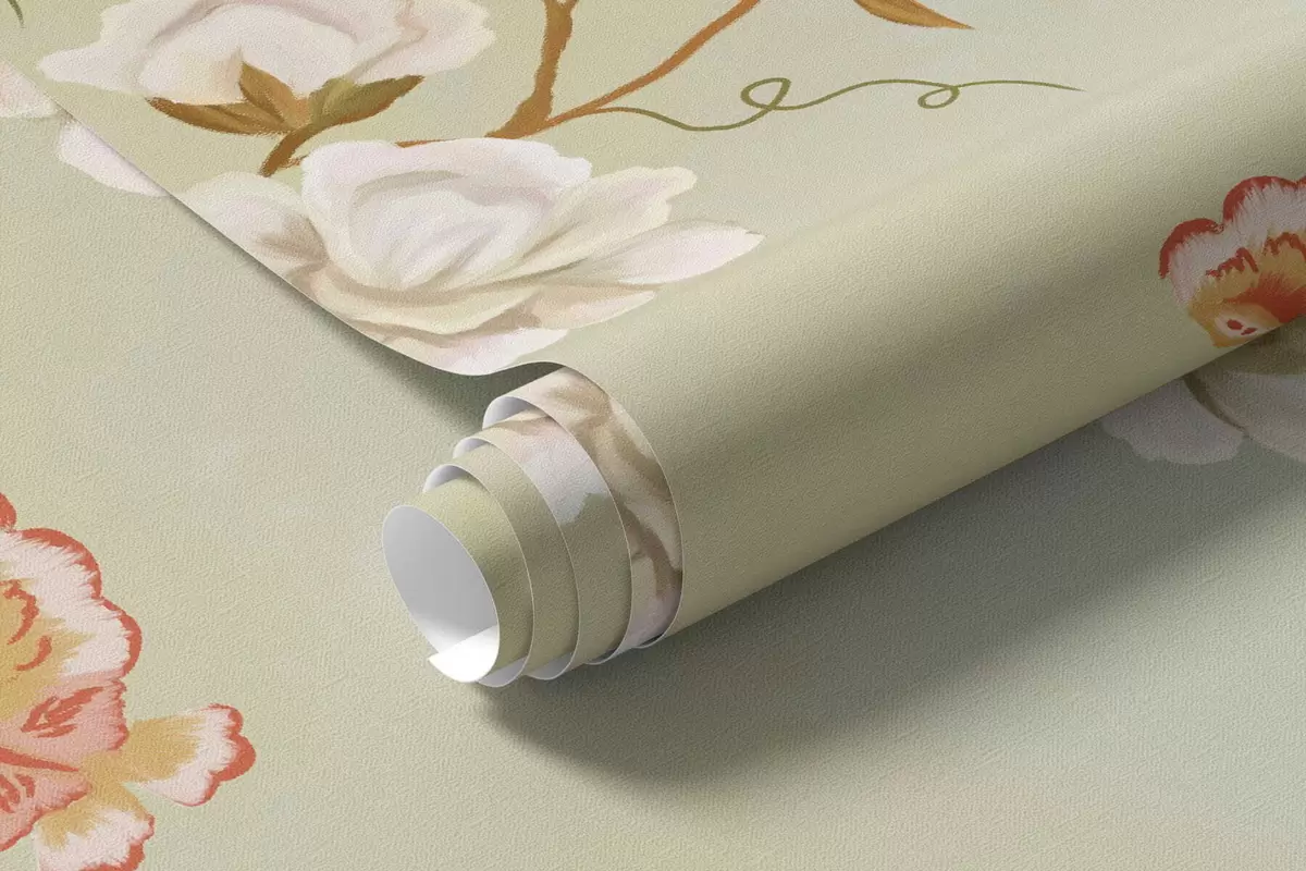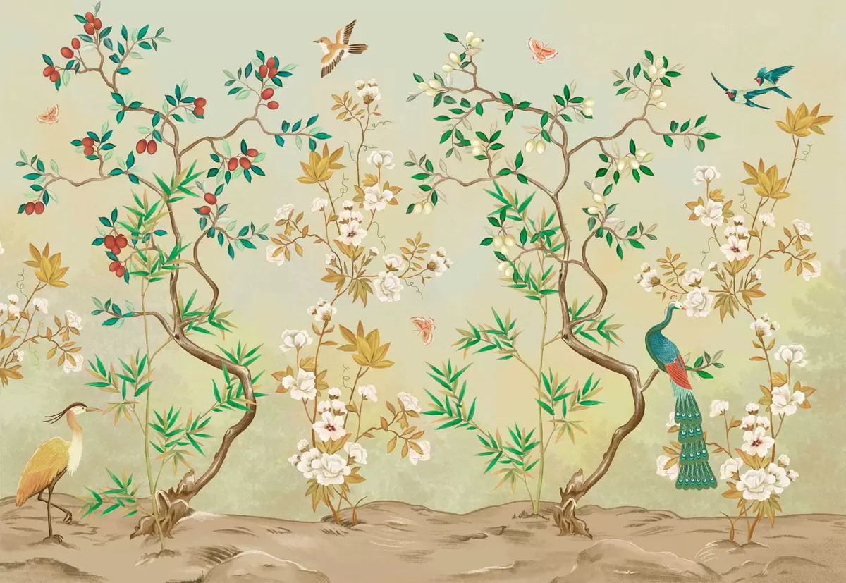 Fototapeten Szene mit Bäumen, Blumen und Vögeln, heller Hintergrund N° w05004v1