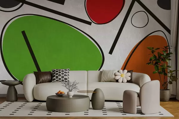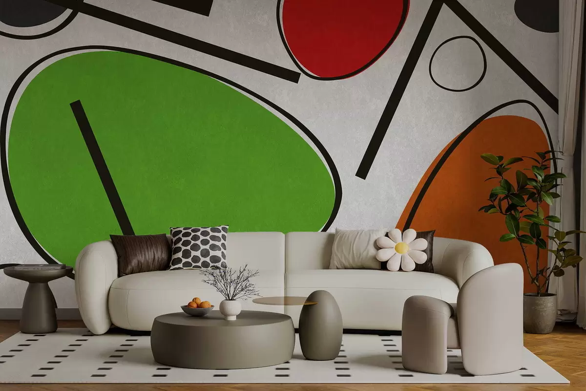 Fototapeten Abstrakte geometrische Formen mit Linien und kräftigen Farbfeldern N° w05017v1