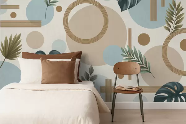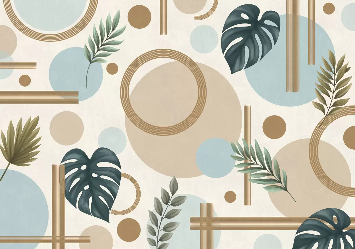 Fototapeten Geometrisches Muster mit Blättern und Kreisen in ruhigen Farbtönen N° w05018