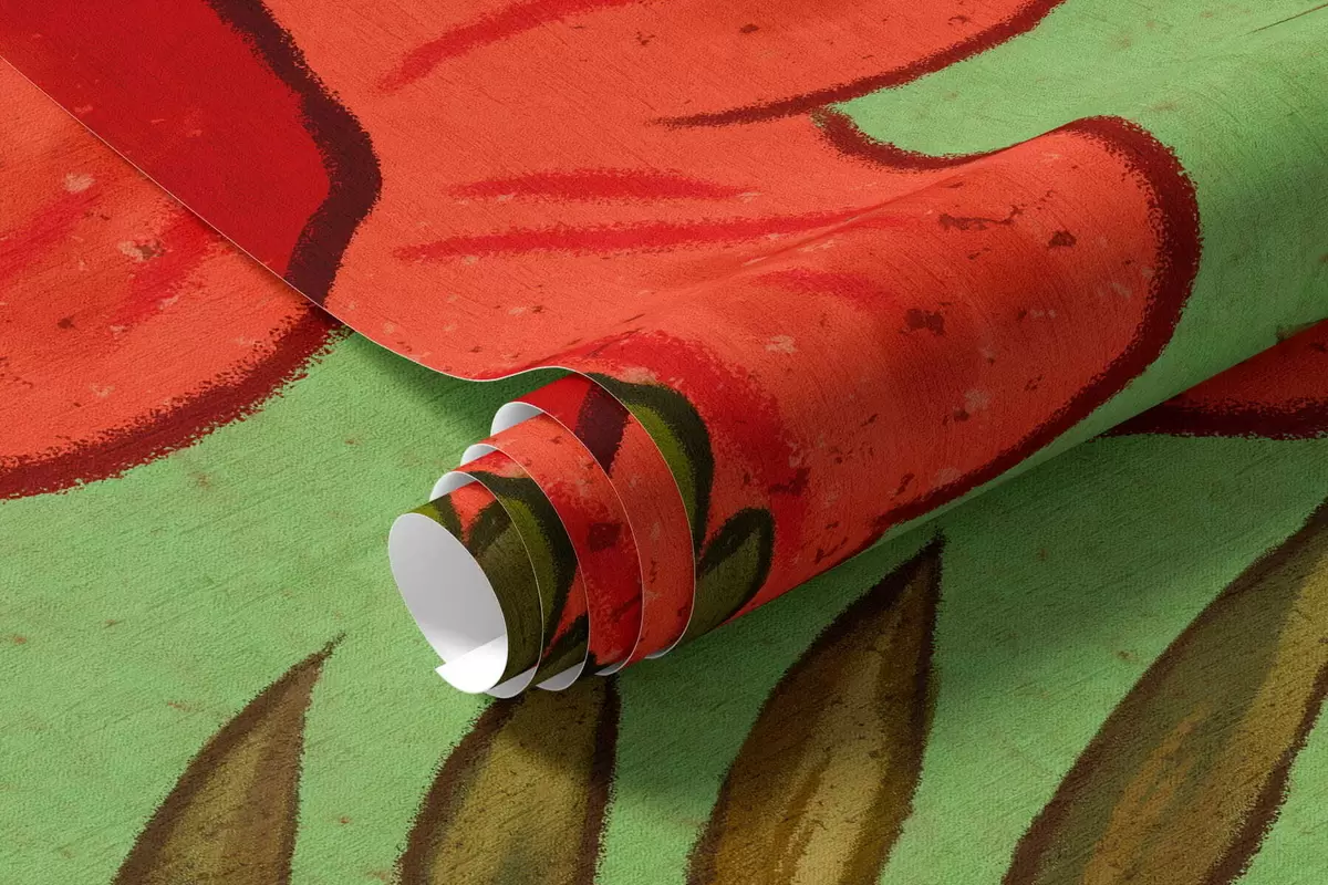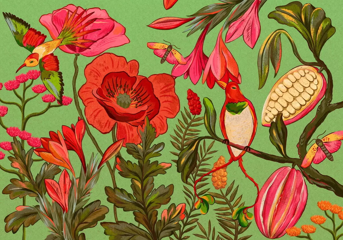 Fototapeten Dekorative Blumen und Vögel auf grünem Hintergrund N° w05036v1