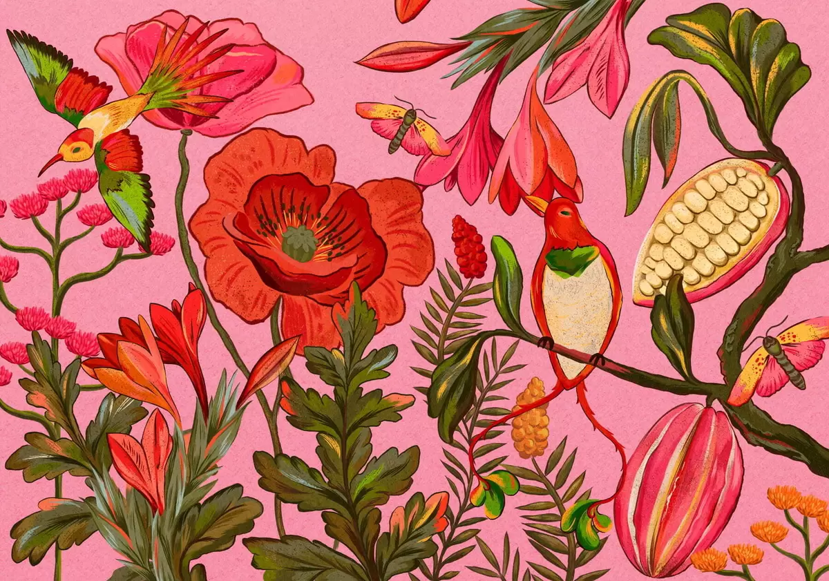 Fototapeten Dekorative Blumen und Vögel auf rosa Hintergrund N° w05036v2