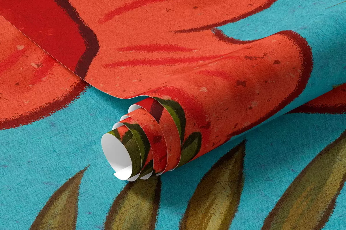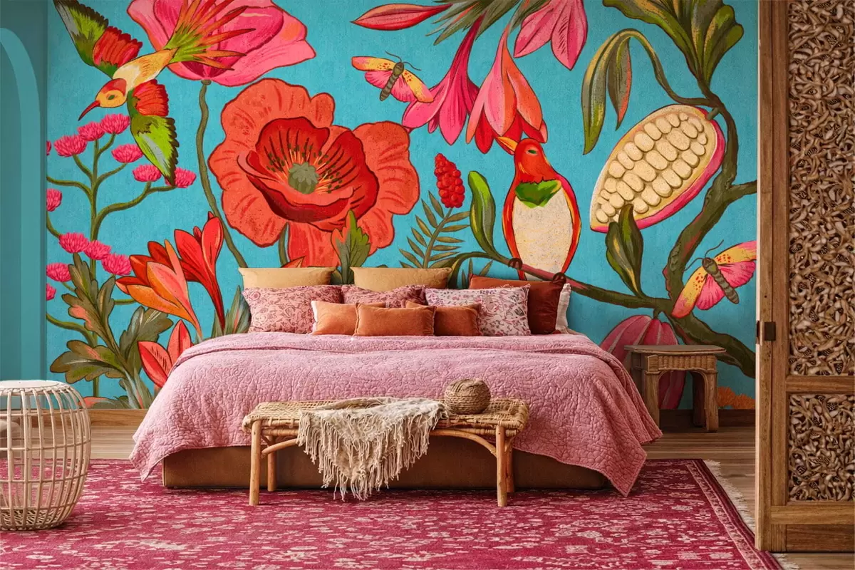 Fototapeten Dekorative Blumen und Vögel auf blauem Hintergrund N° w05036v3
