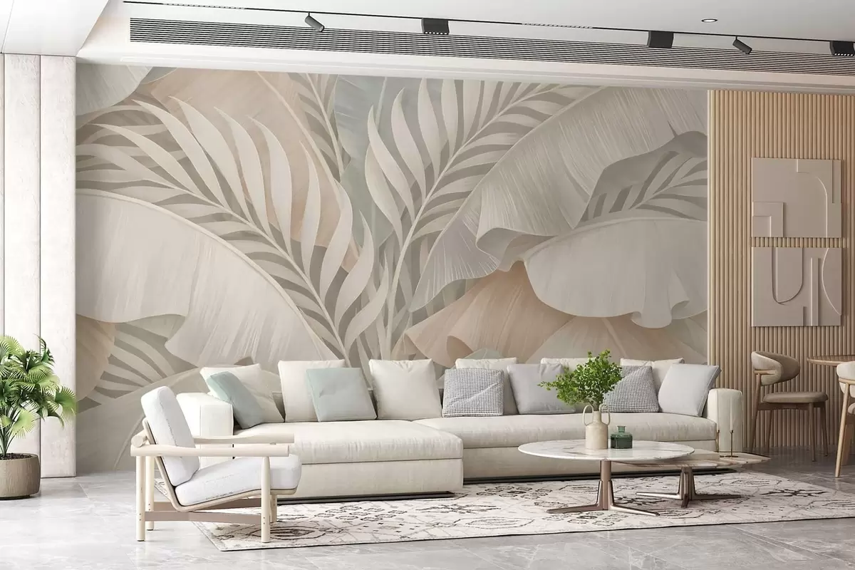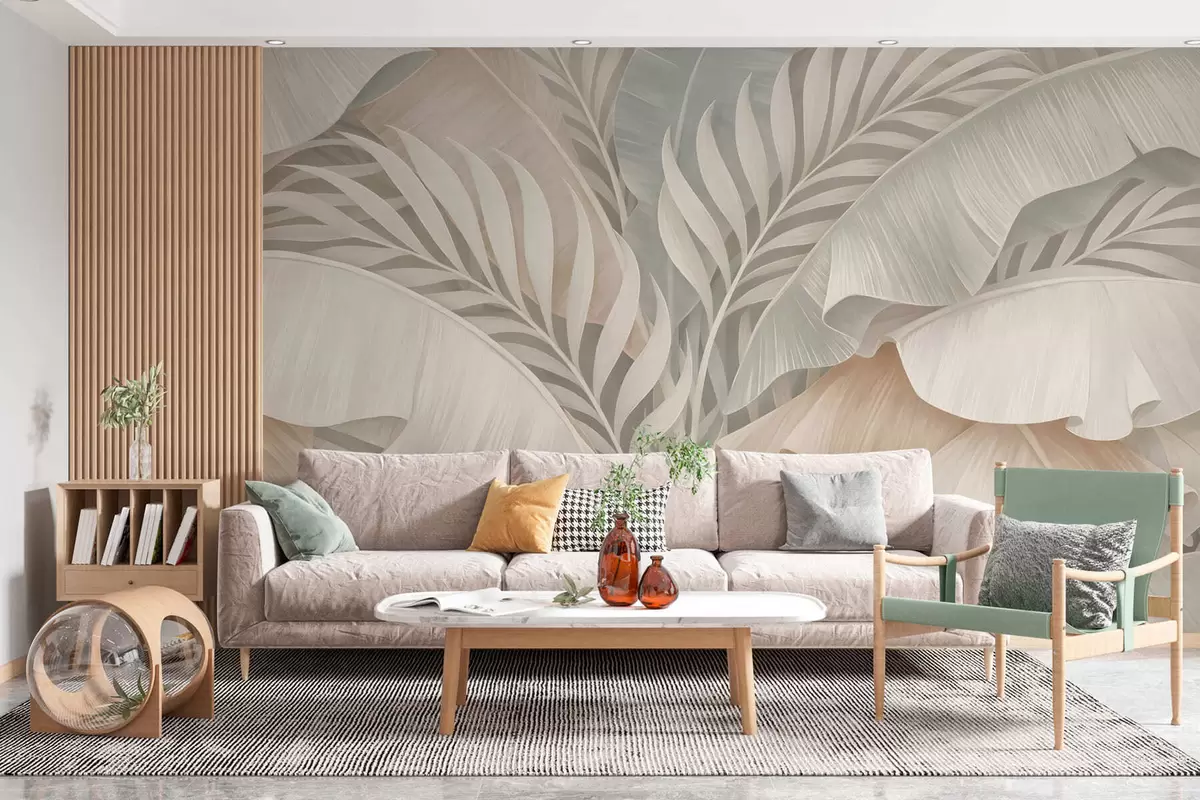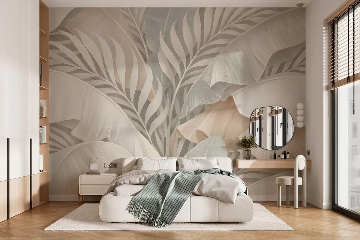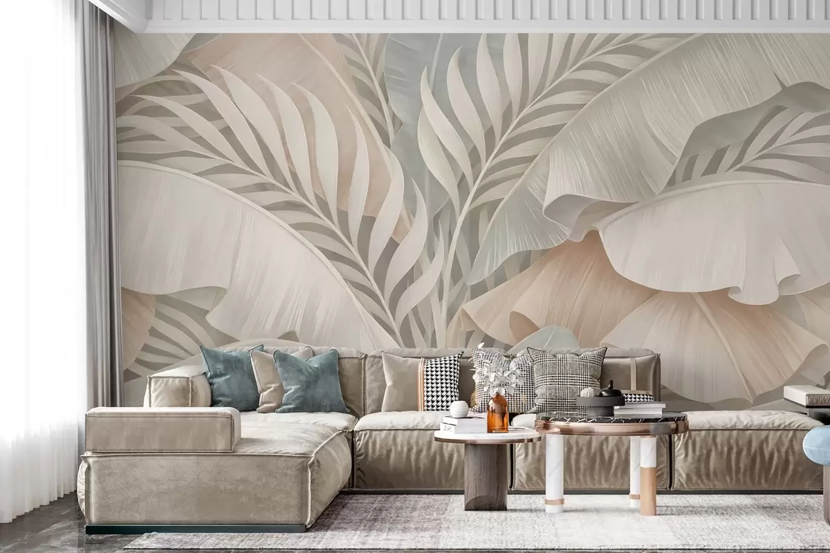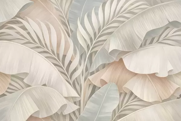 Fototapeten große tropische Blätter in Pfirsich- und mattem Türkistönen N° w05062