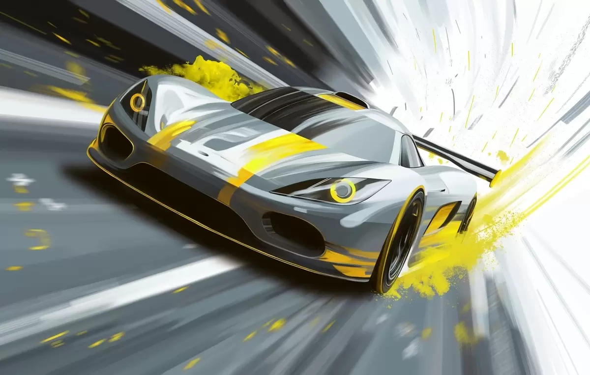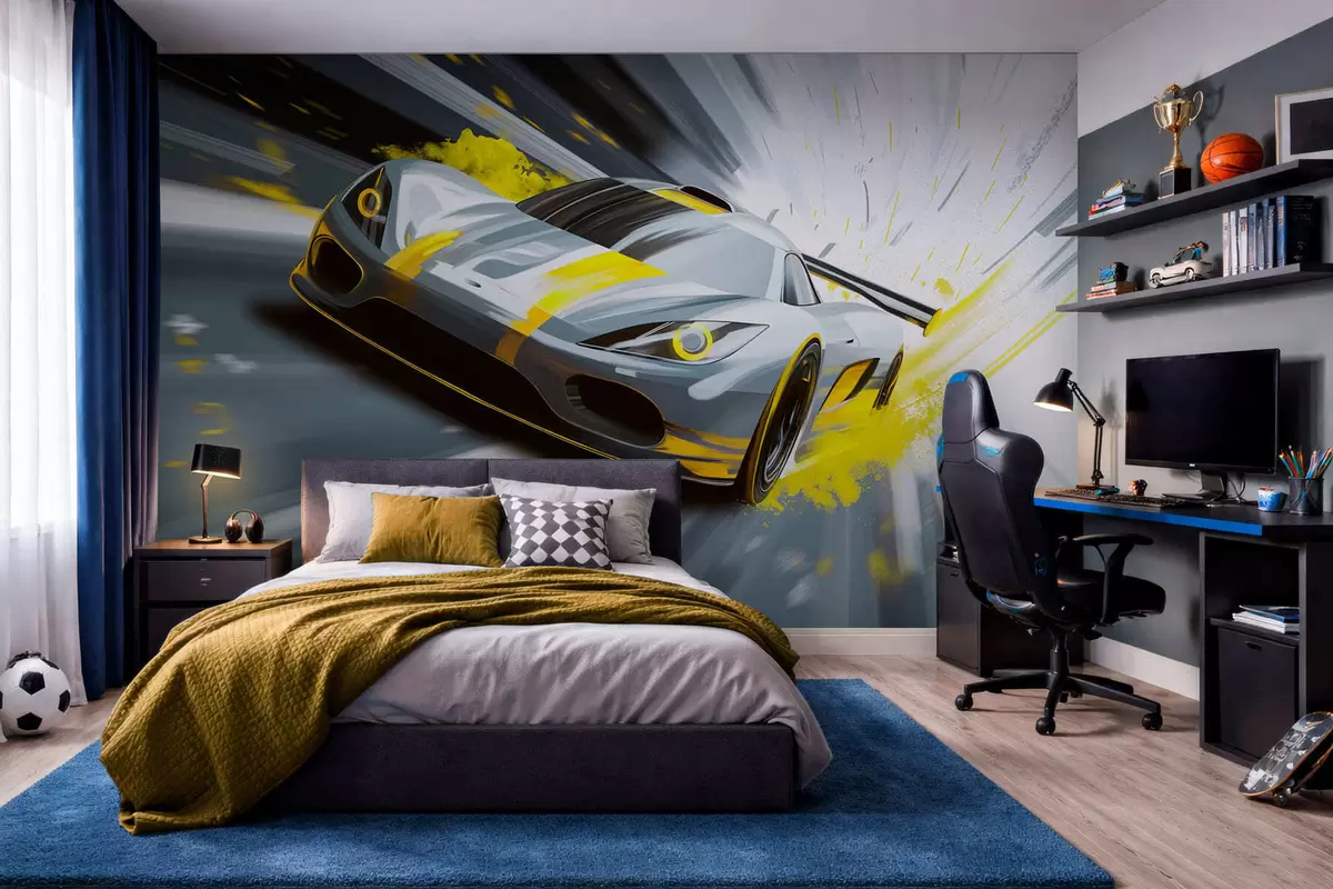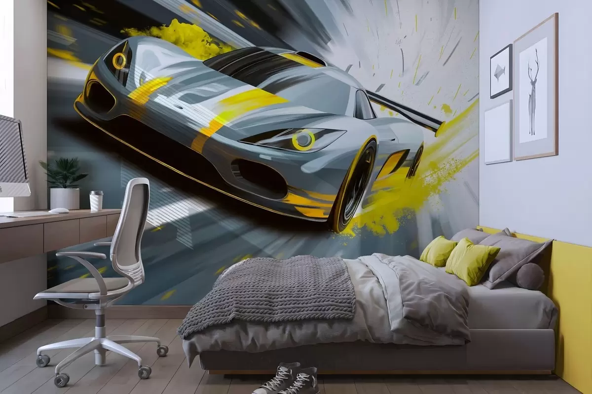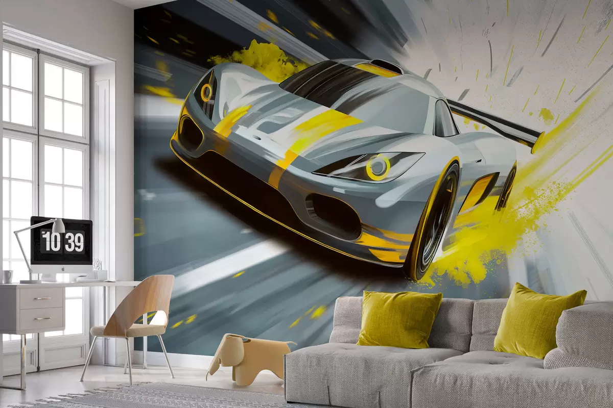Fototapeten Dynamischer Sportwagen im digitalen Zeichenstil mit gelben Akzenten N° w05069v2