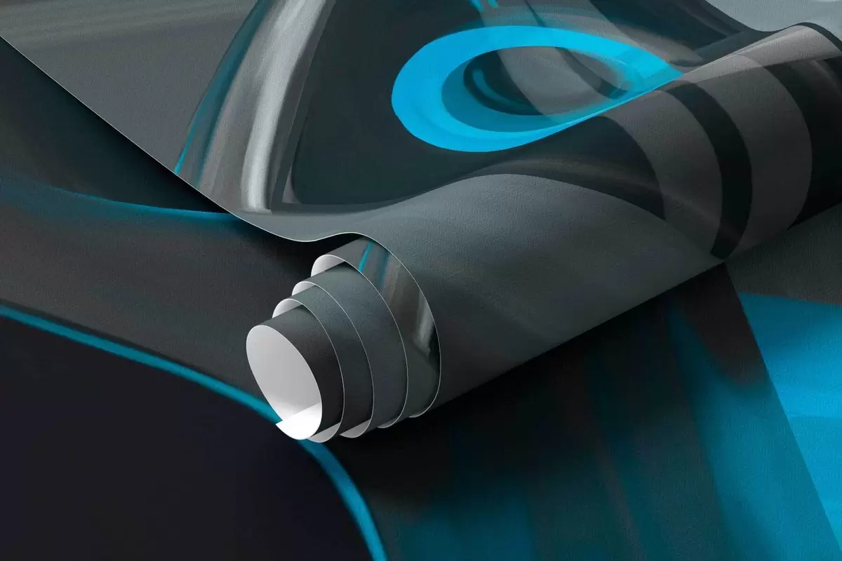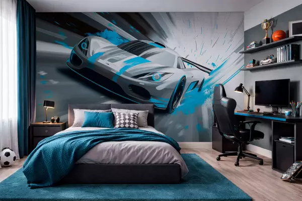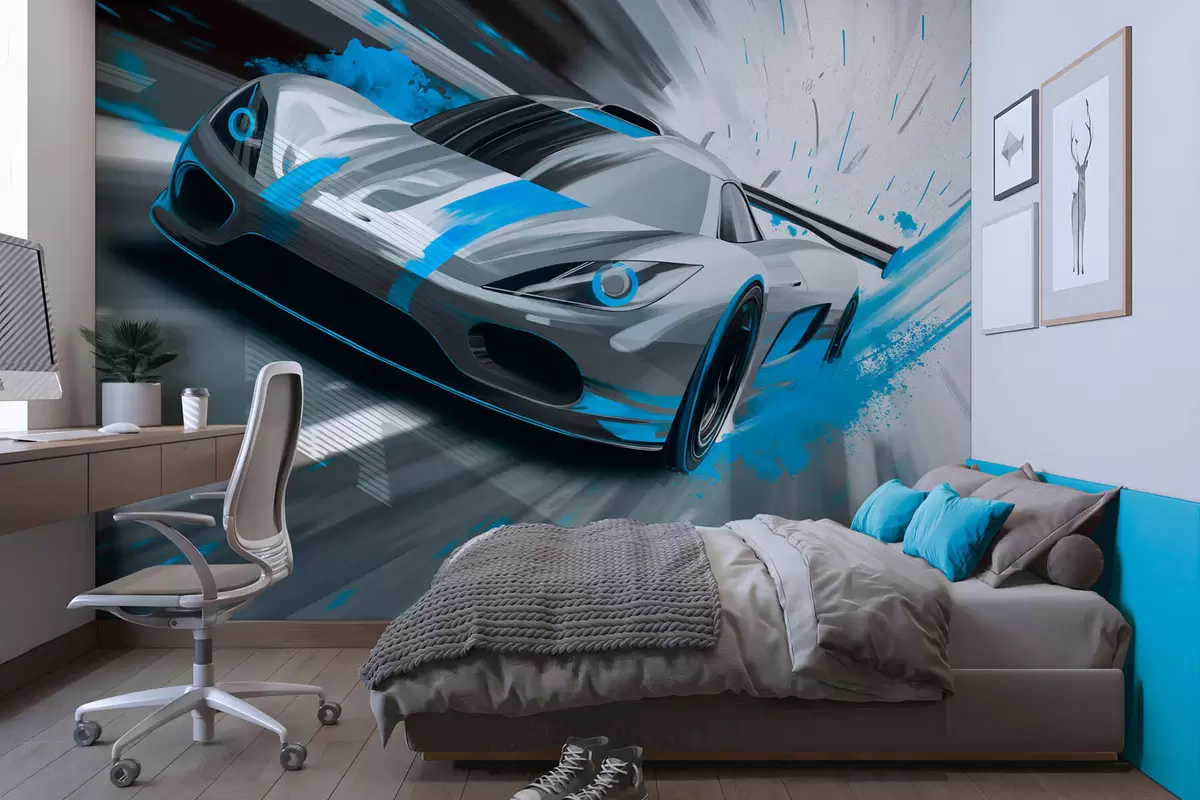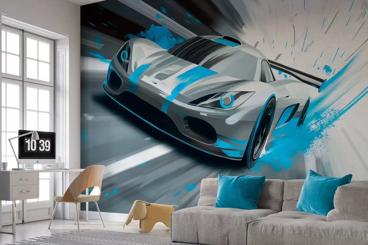 Fototapeten Dynamischer Sportwagen im digitalen Zeichenstil mit türkisfarbenen Akzenten N° w05069v3