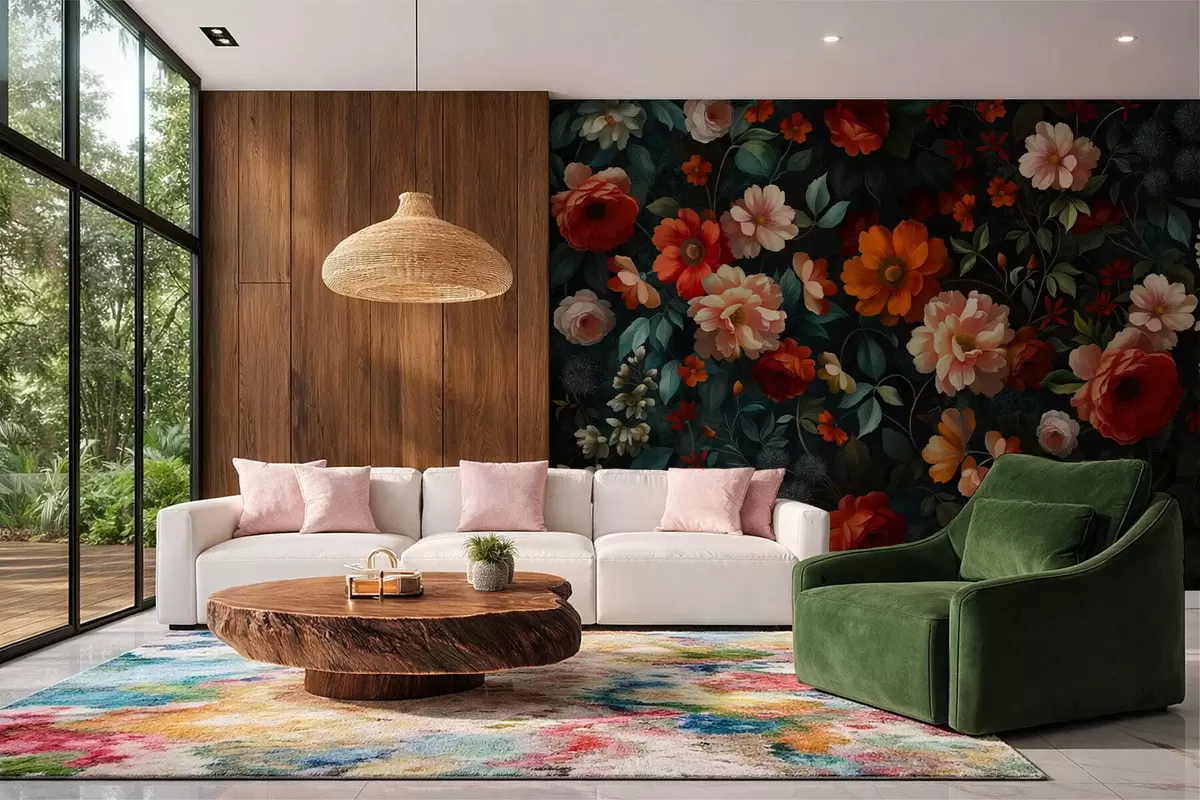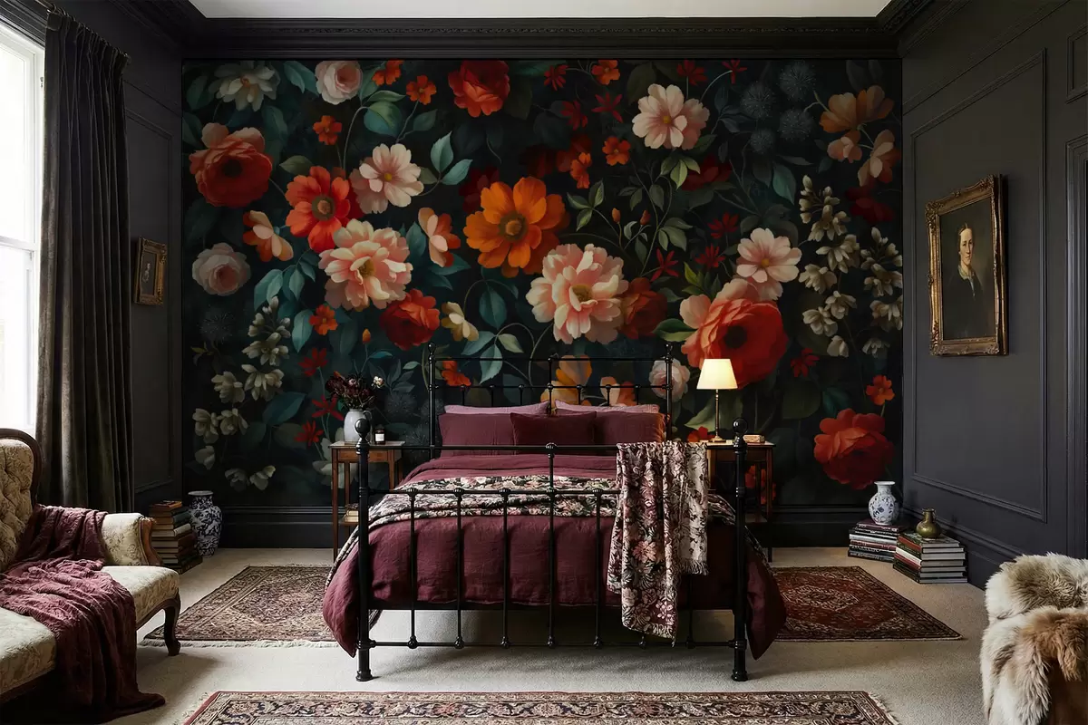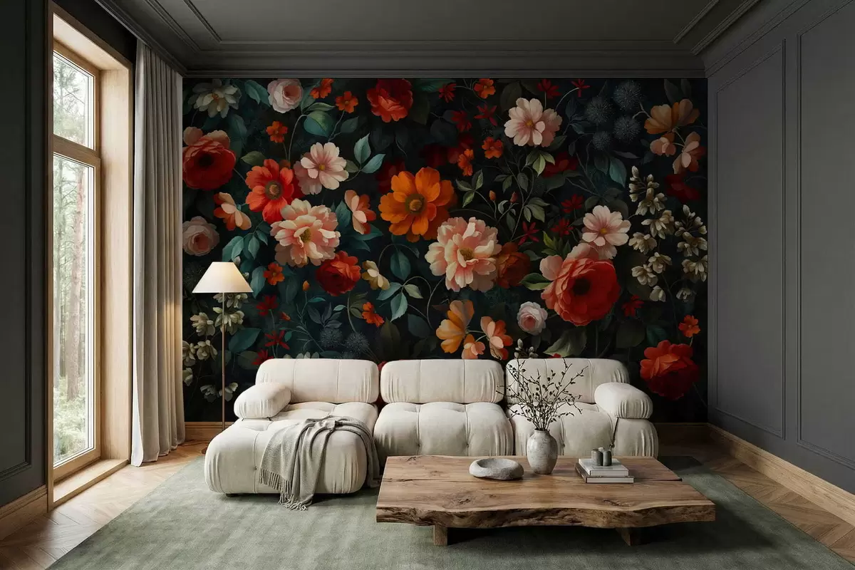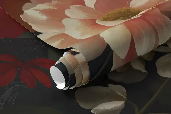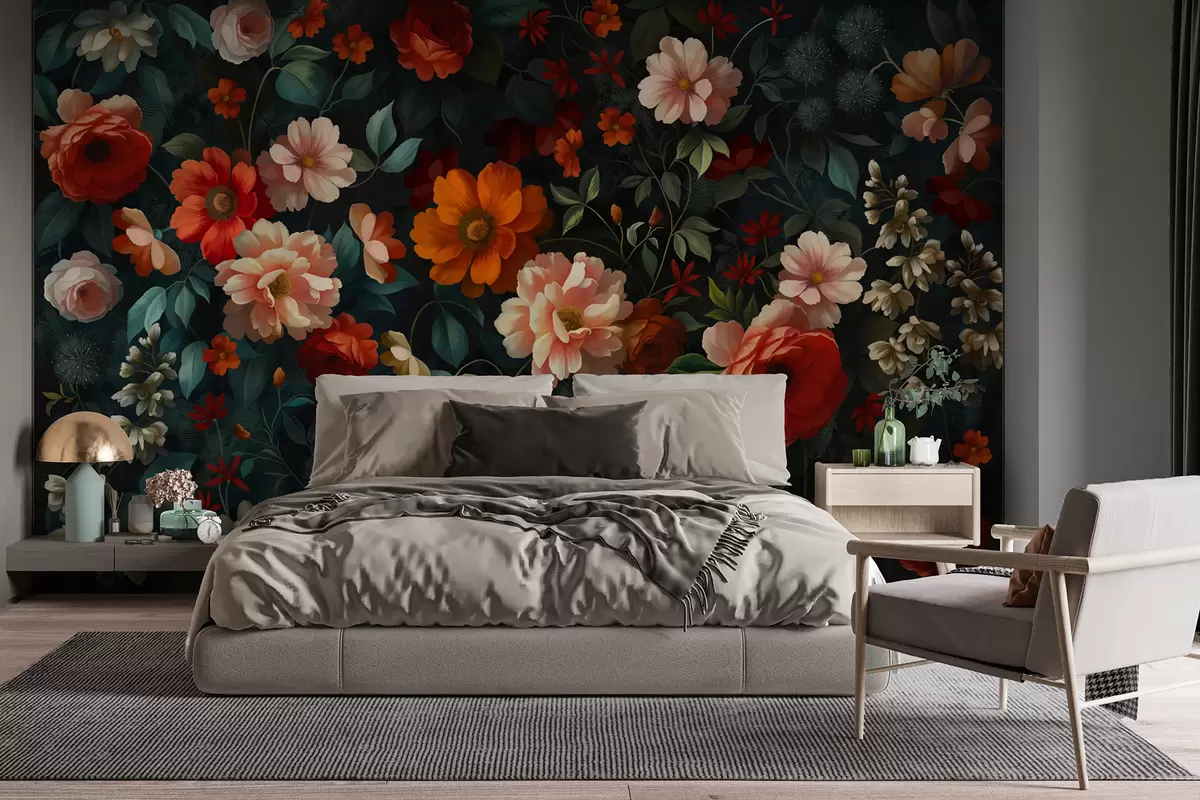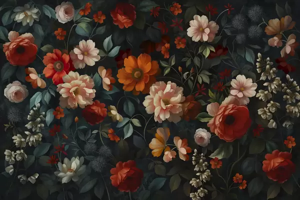 Fototapeten Dunkles Blumenmuster mit üppigen Gartenblumen N° w05087