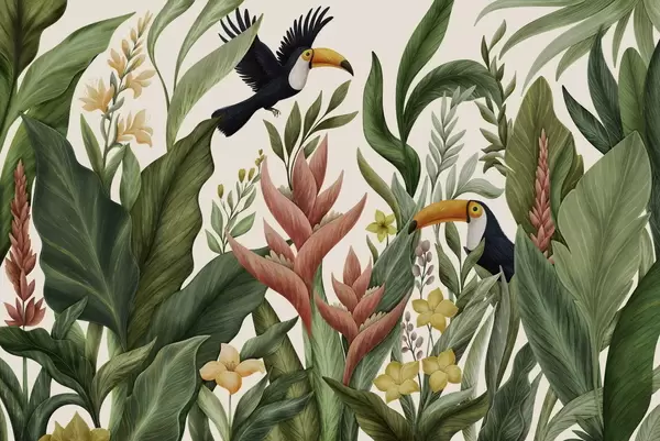 Fototapeten Tropische Pflanzen und Vögel mit großen Schnäbeln vor hellem Hintergrund N° w05088