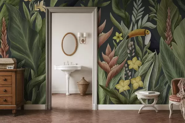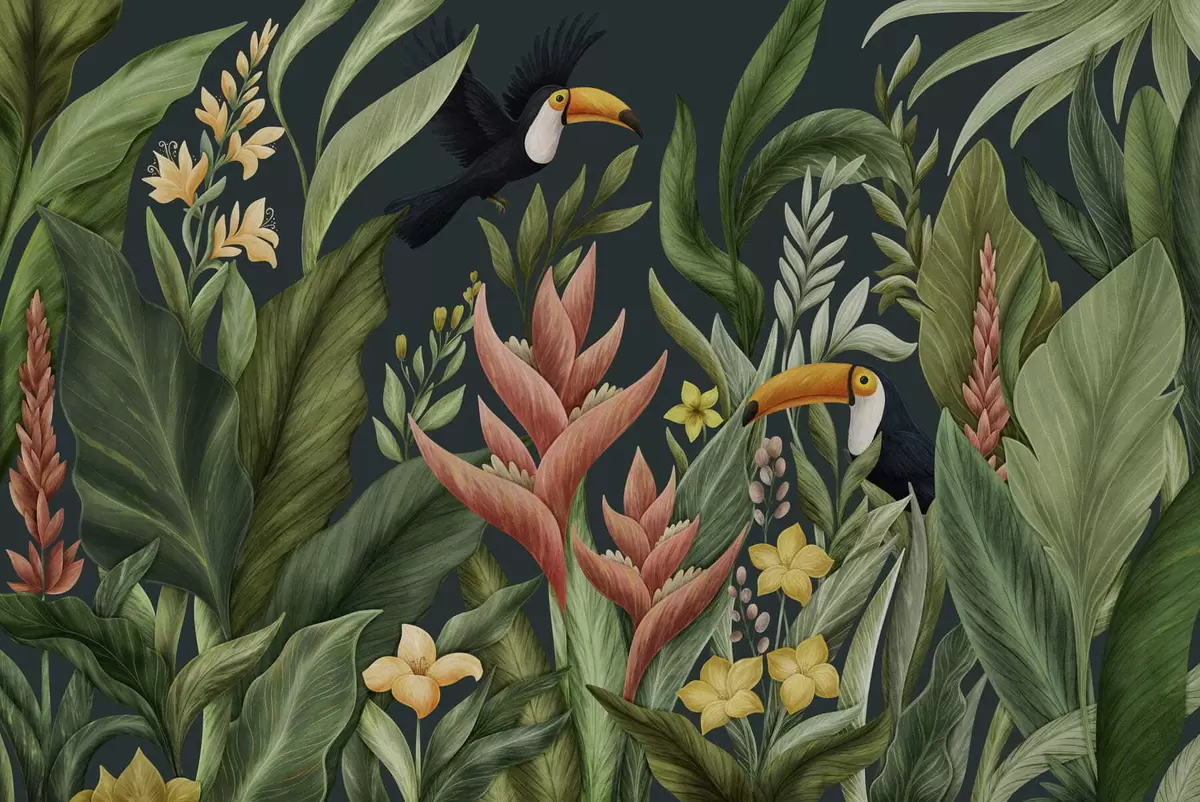Fototapeten Tropische Pflanzen und großschnäbelige Vögel vor dunklem Hintergrund N° w05088v2