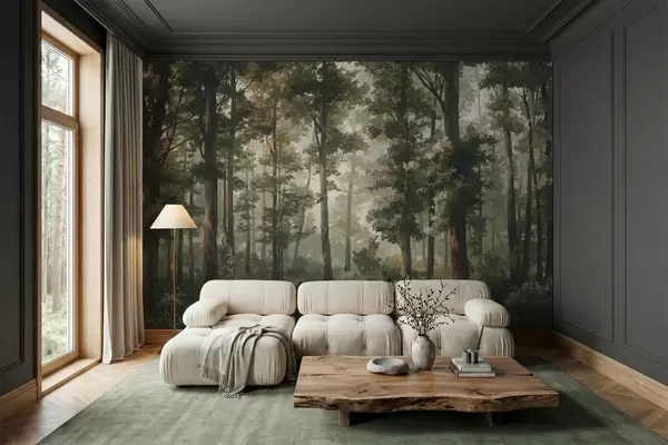 Fototapeten Waldillustration mit Nebel, hohen Bäumen und einem Weg N° w05089