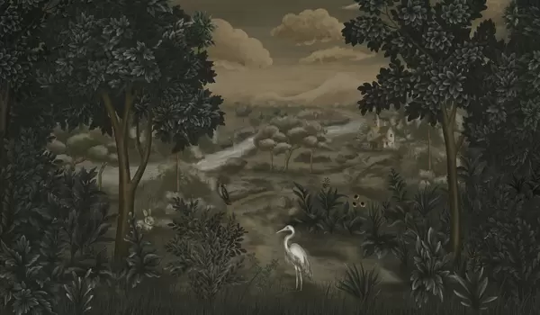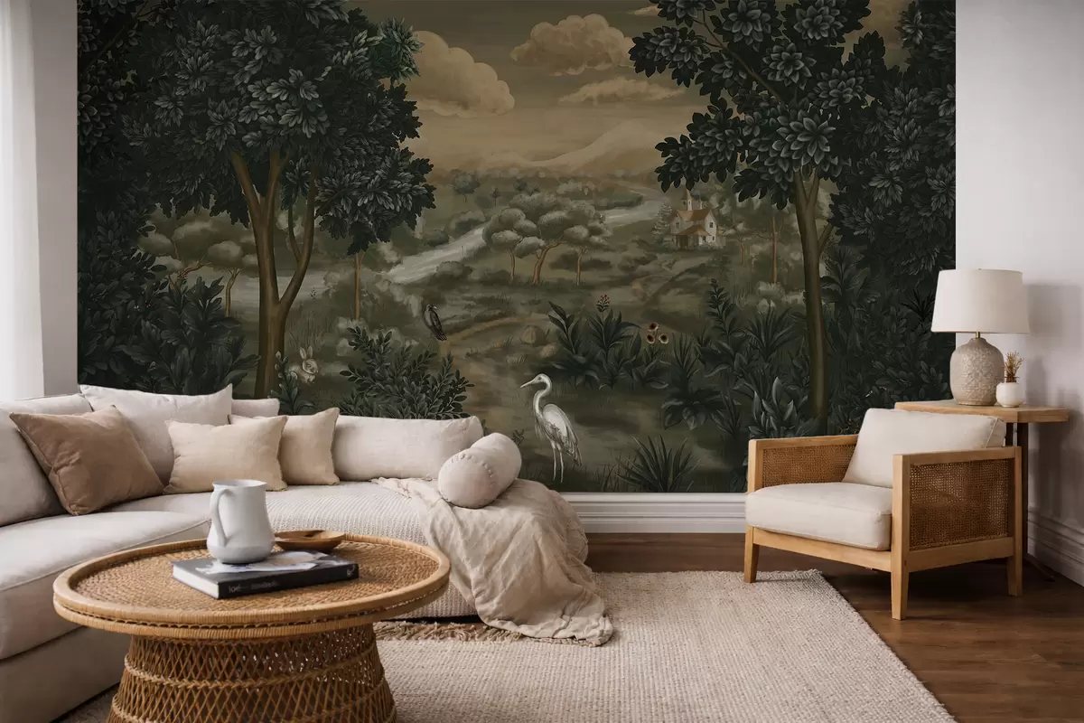Fototapeten Fantasielandschaft mit Fluss, Haus und Vögeln zwischen Bäumen N° w05090