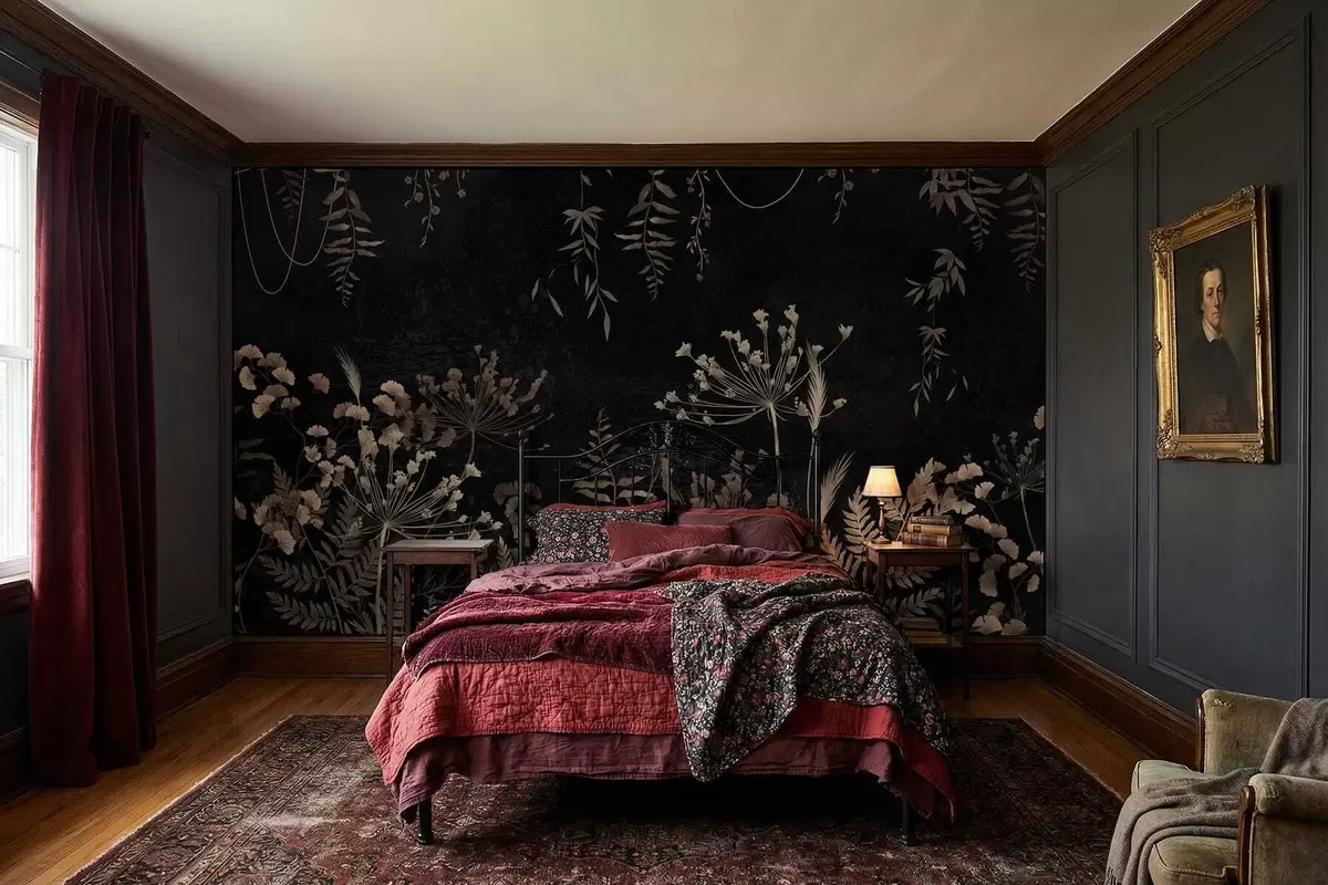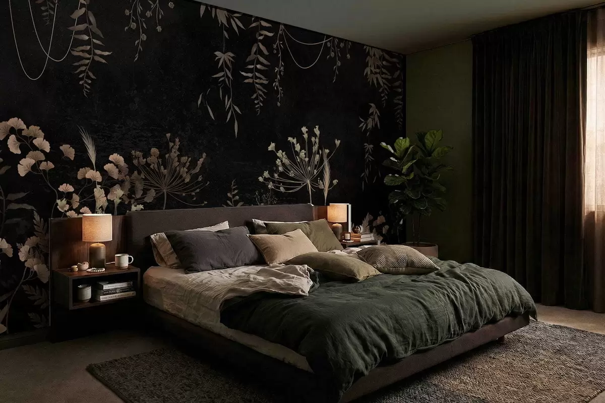 Fototapeten Dunkles botanisches Muster mit Blumen und Blättern N° w05092