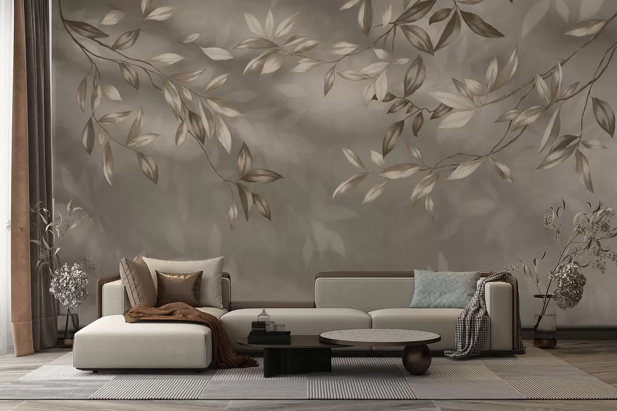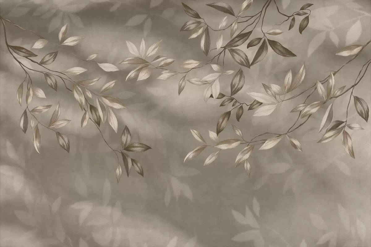 Fototapeten Zarte, blättrige Zweige in Beigetönen auf hellem Hintergrund N° w05113v2