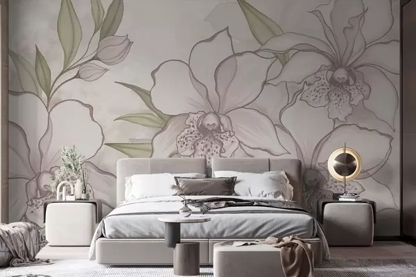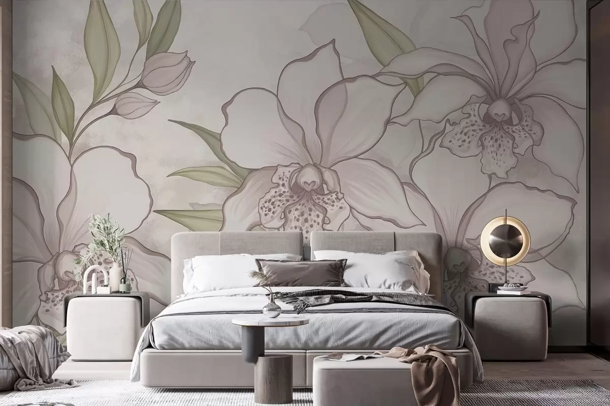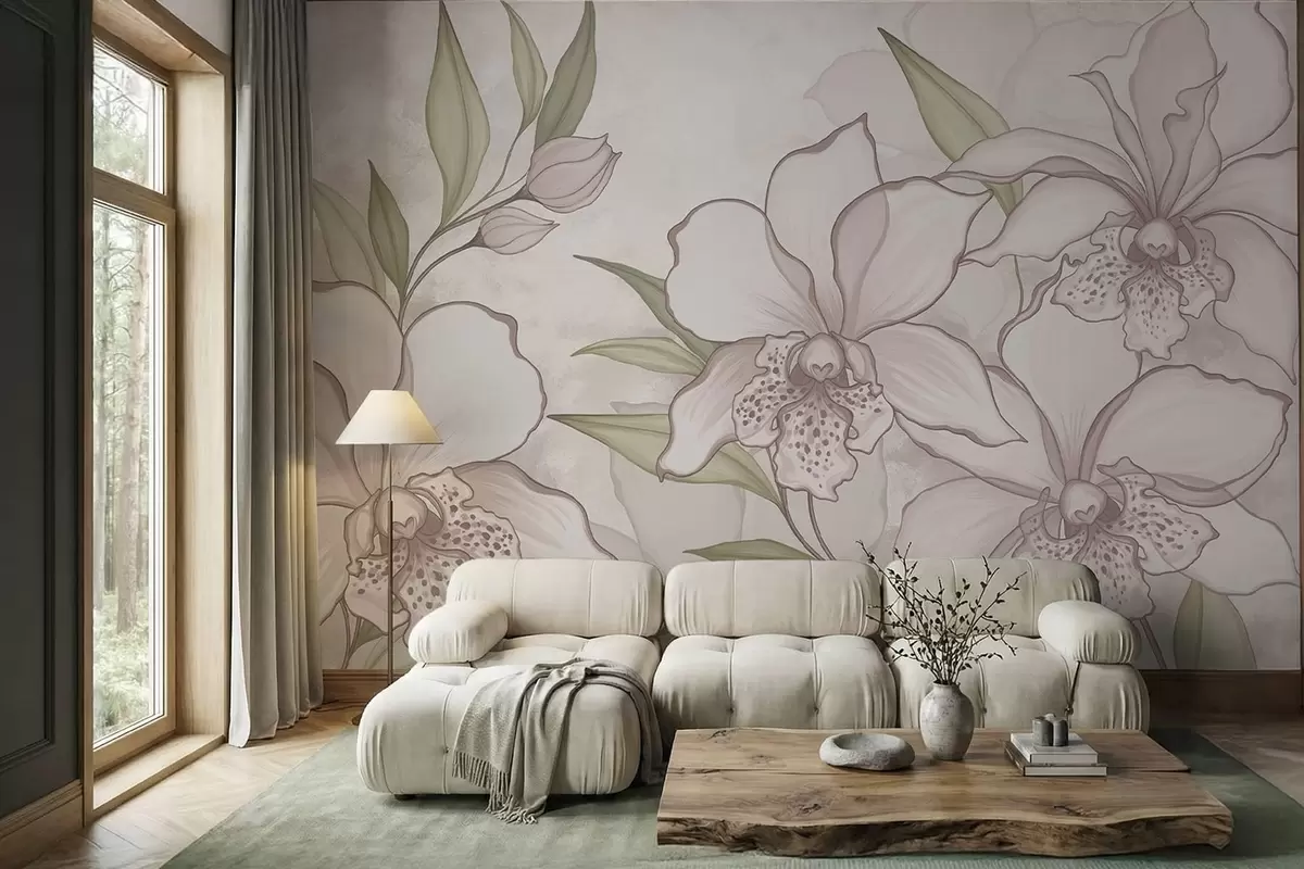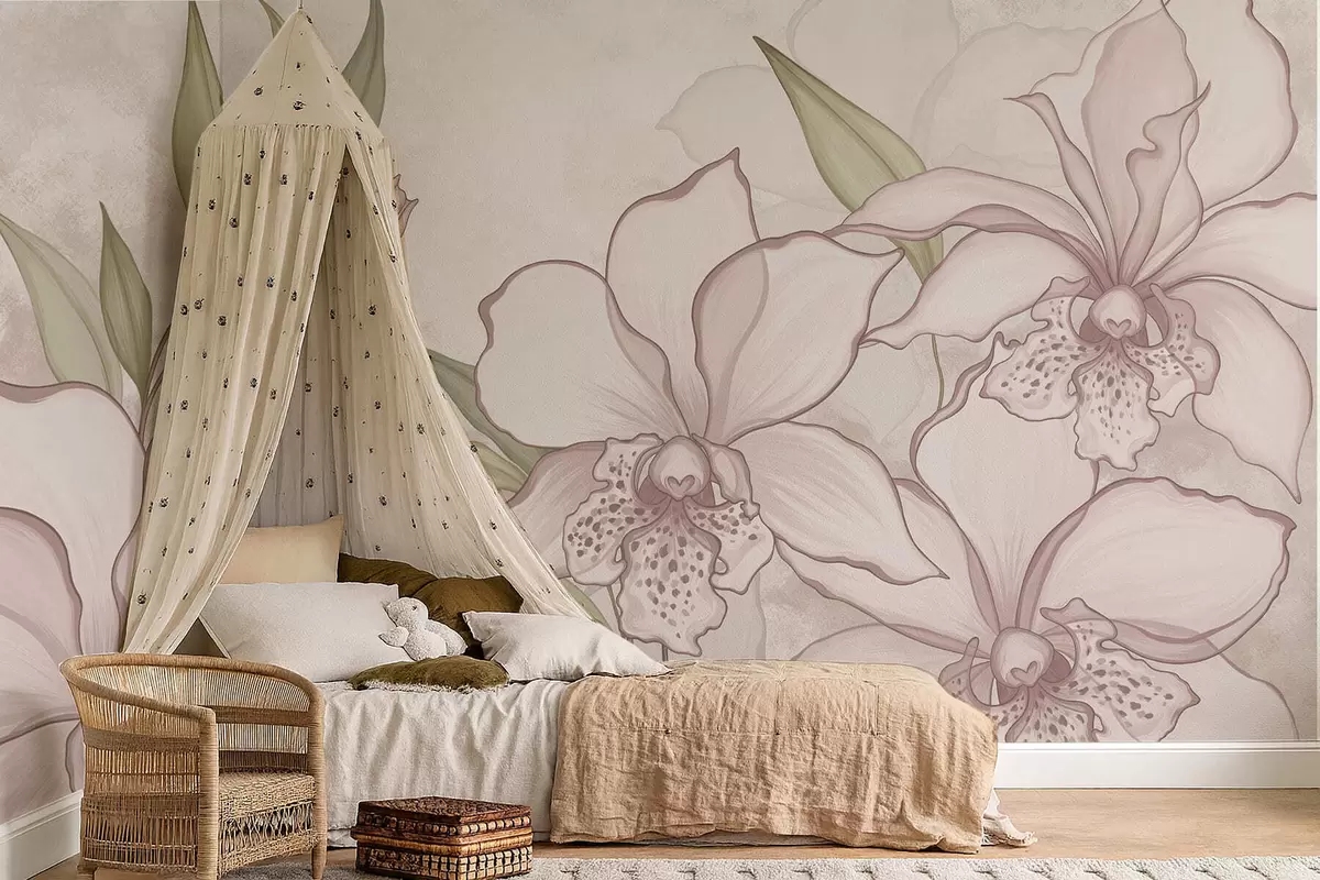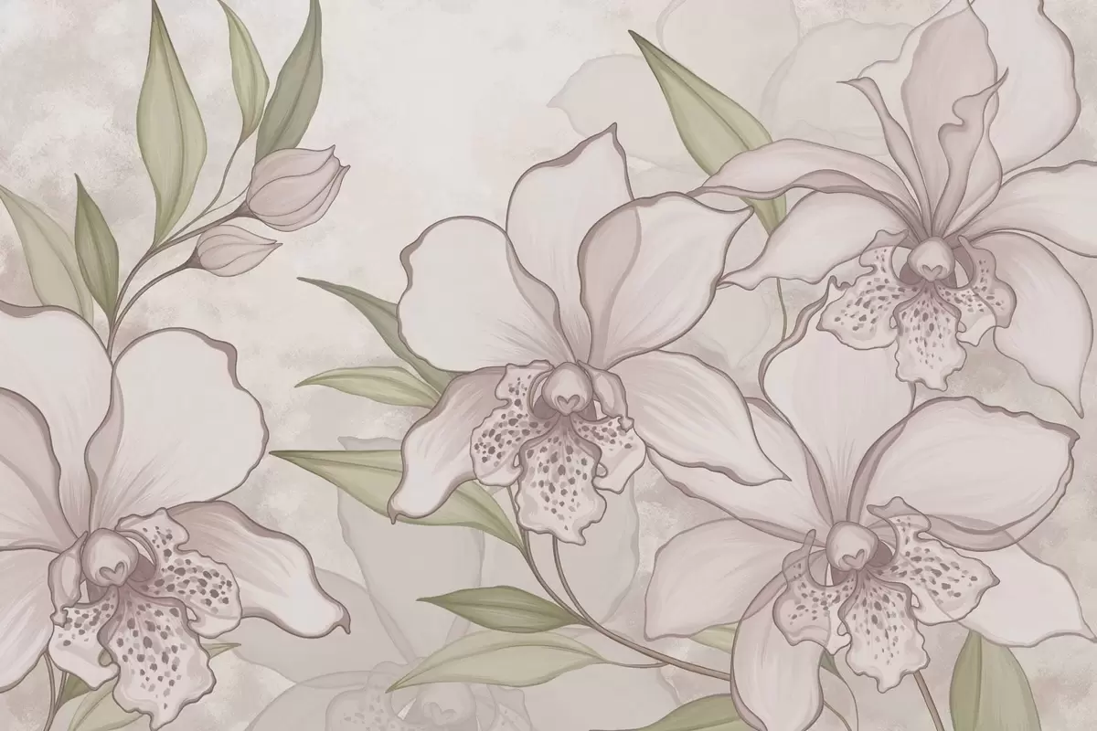 Fototapeten Illustration von blassen Orchideen mit Blättern auf beigem Hintergrund N° w05117