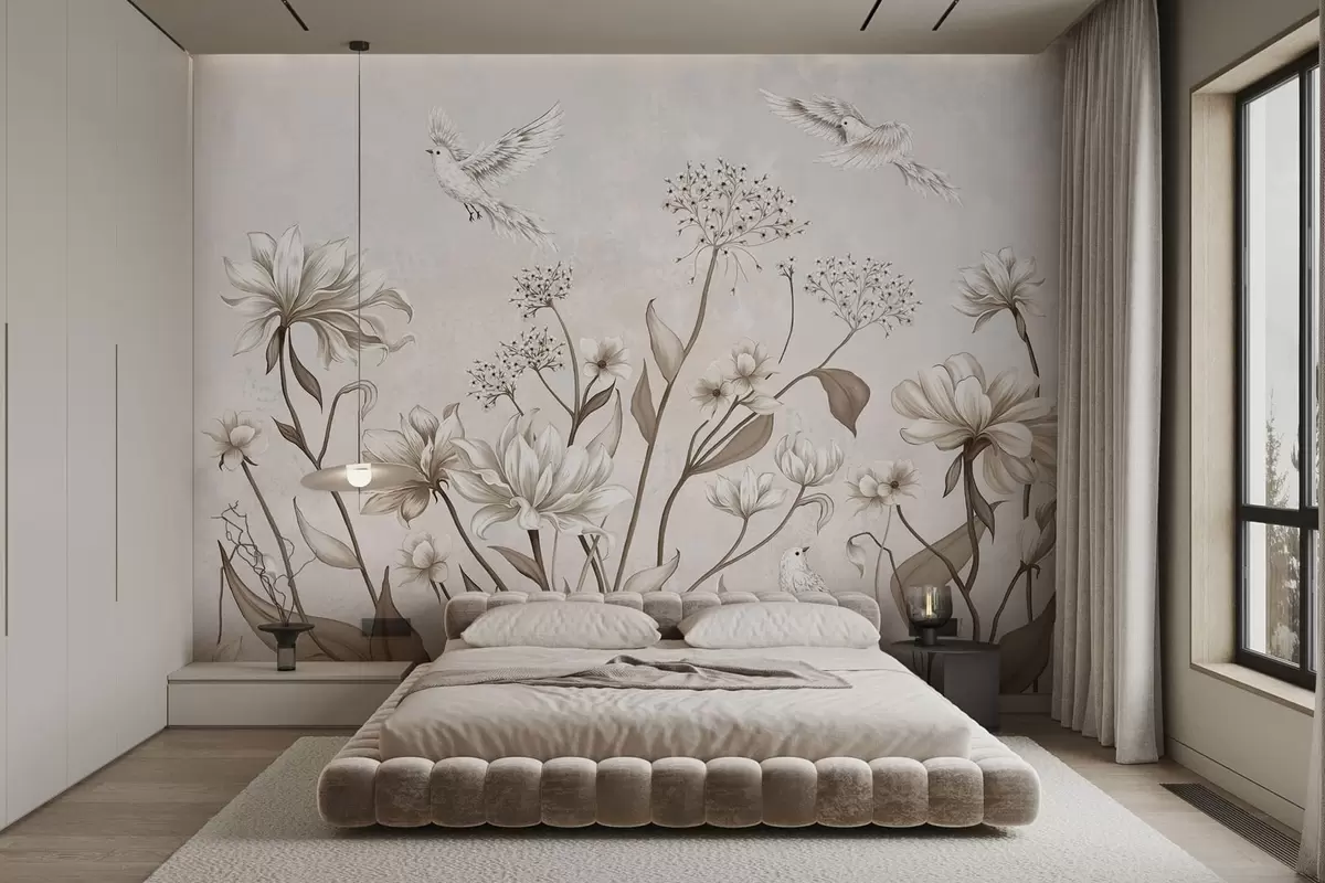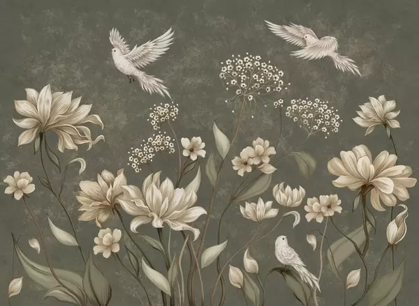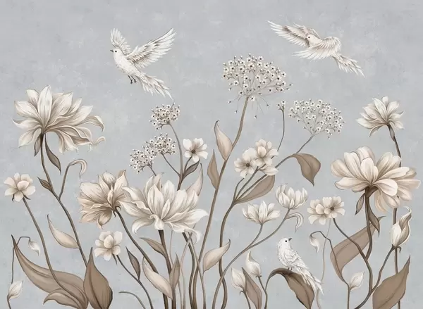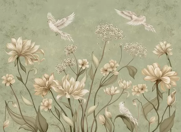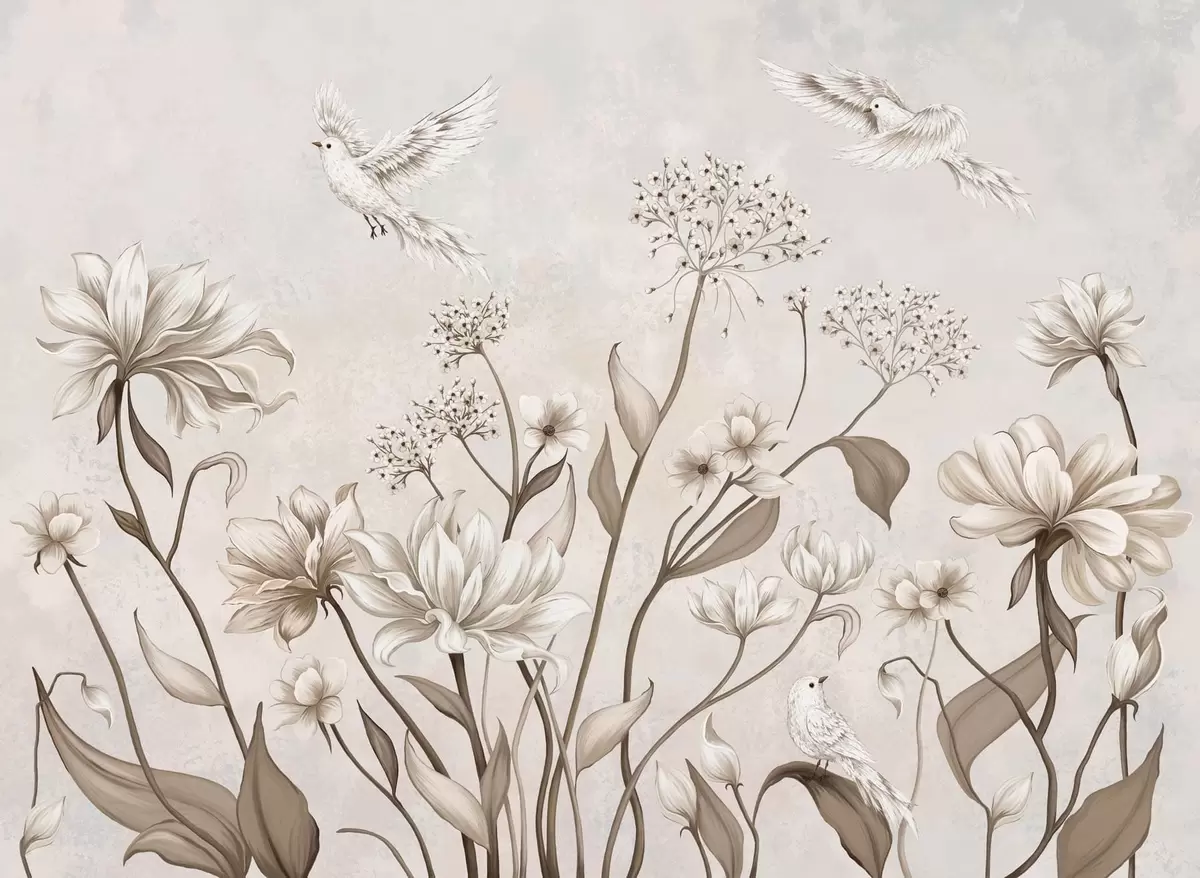 Fototapeten Helle Blumen und Vögel vor einem sanften Hintergrund N° w05118