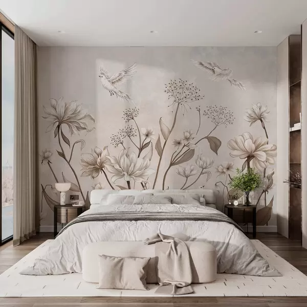 Fototapeten Helle Blumen und Vögel vor einem sanften Hintergrund N° w05118