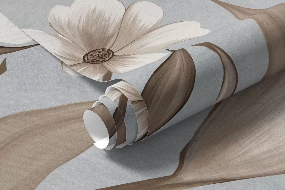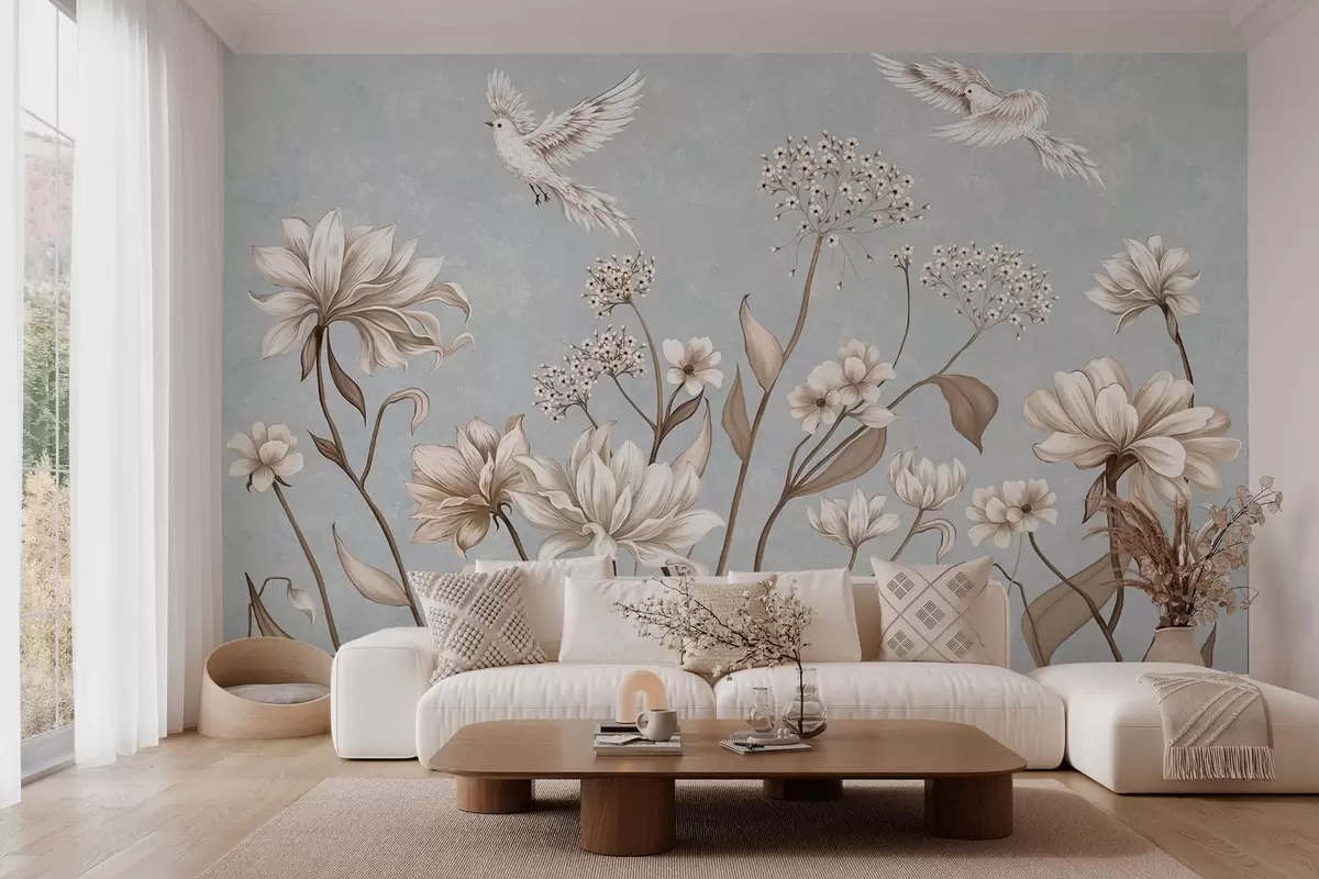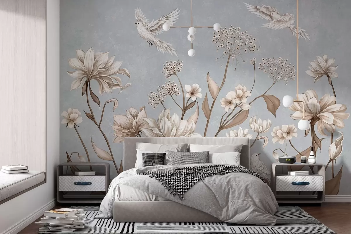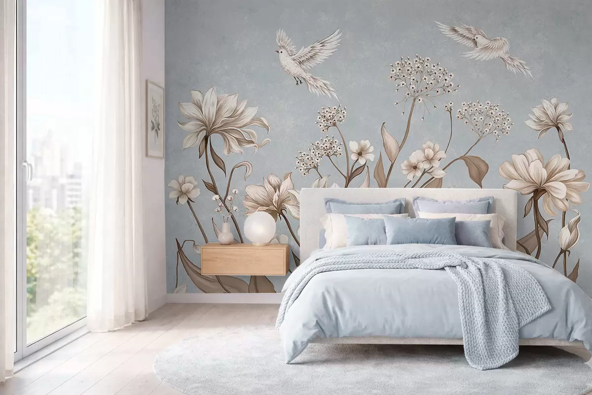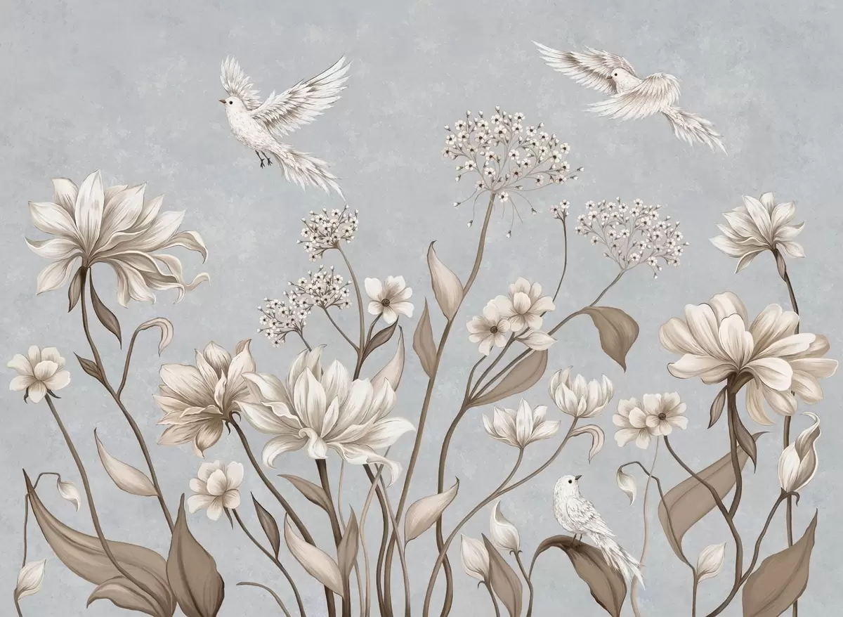 Fototapeten Blumen und Vögel auf einem kühlen grau-blauen Hintergrund N° w05118v2
