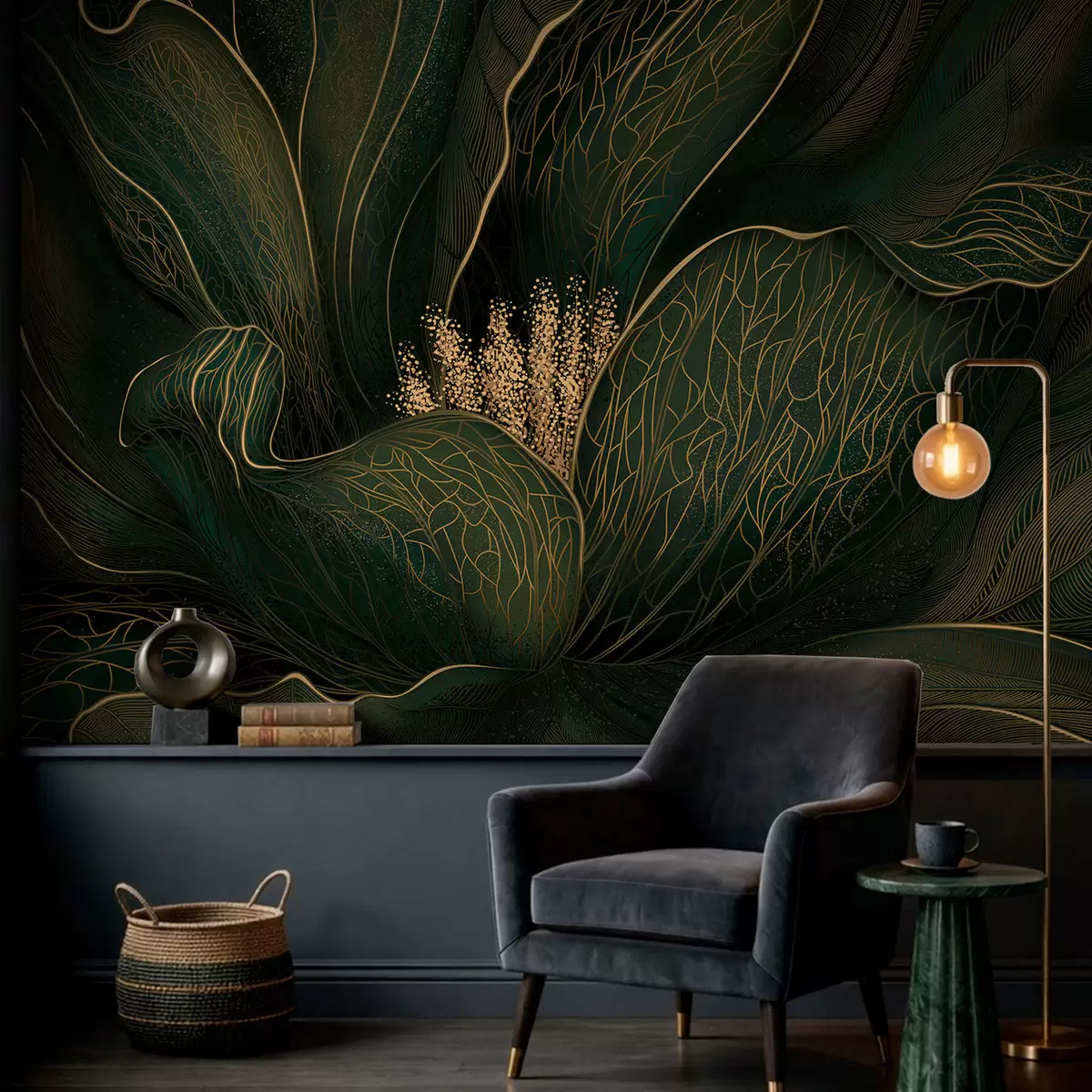 Fototapeten Dunkelgrüne abstrakte Blume mit feinen Linien N° w05119v1