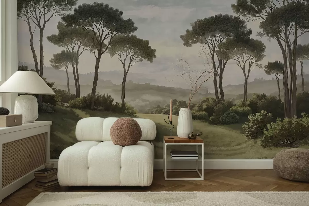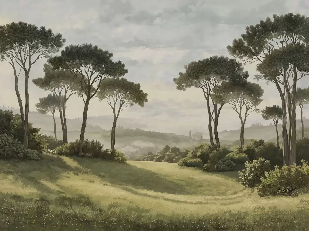 Fototapeten Landschaft mit Bäumen, Wiese und Nebel in der Ferne N° w05122v1