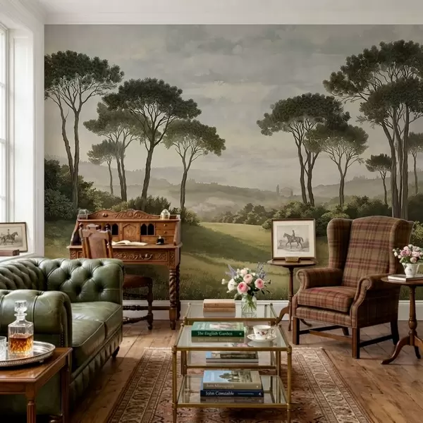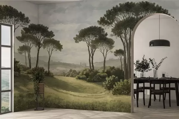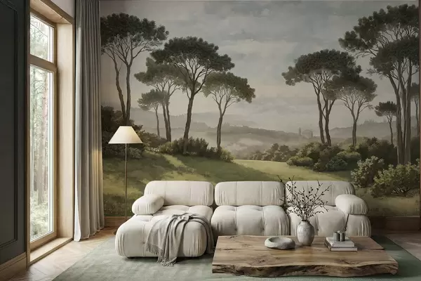Fototapeten Landschaft mit Bäumen, Wiese und Nebel in der Ferne N° w05122v1