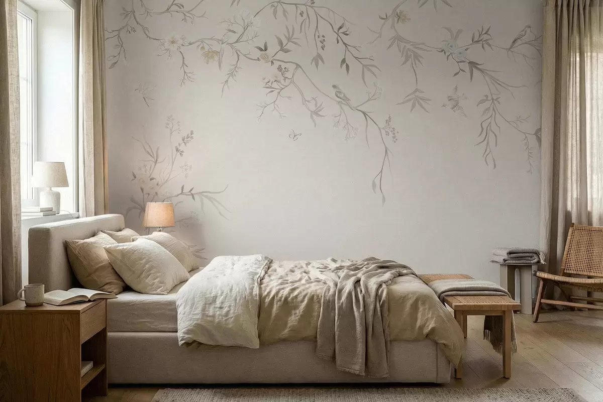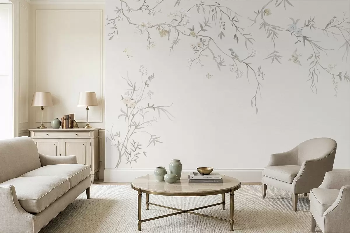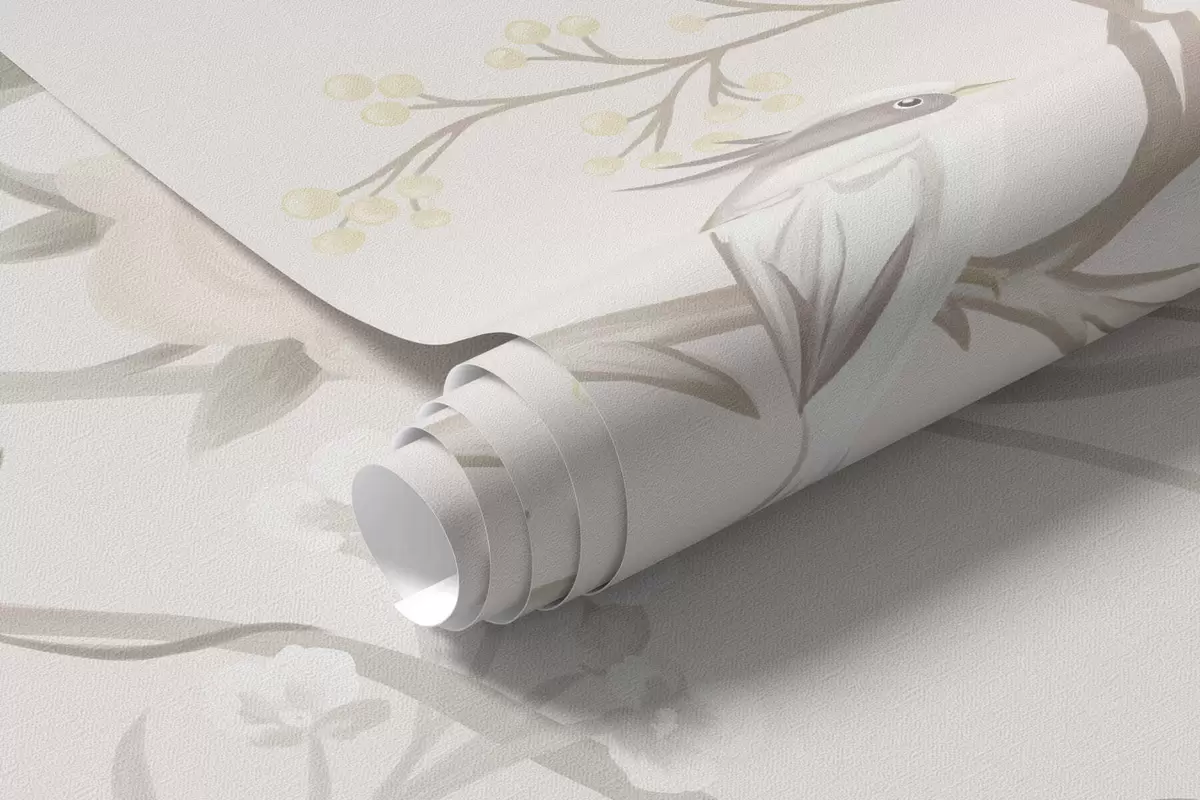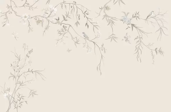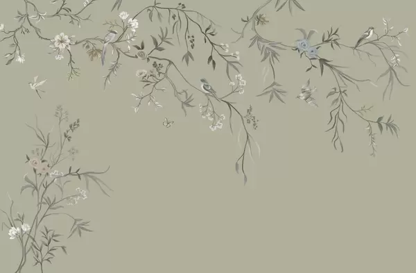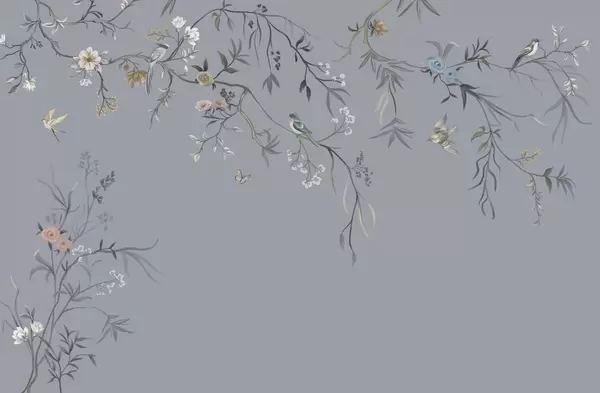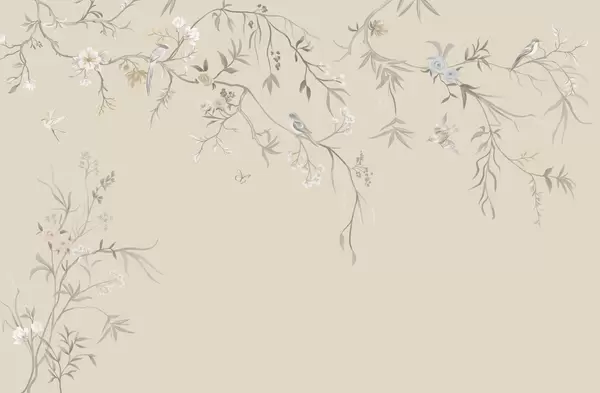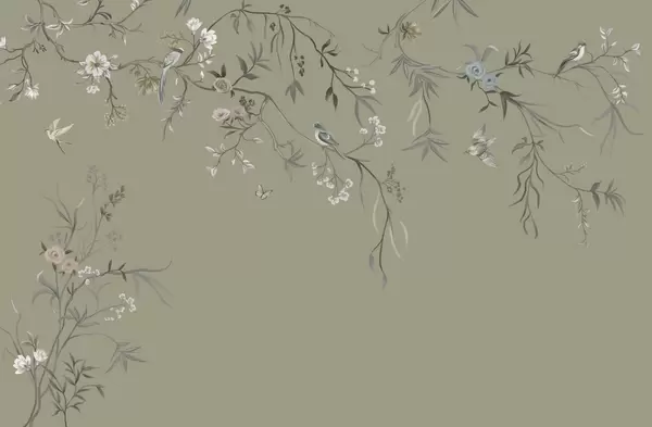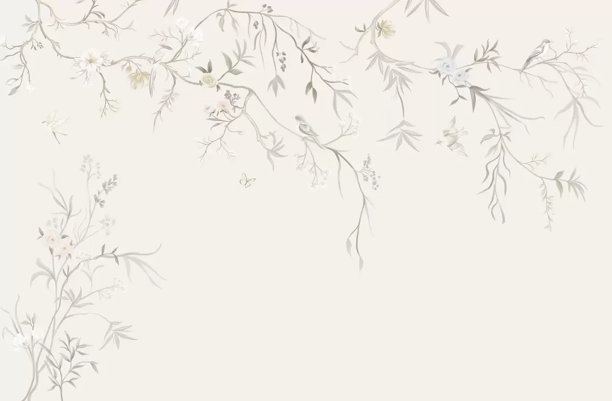 Fototapeten Zarte Blumen und Vögel auf Kreidehintergrund N° w05127