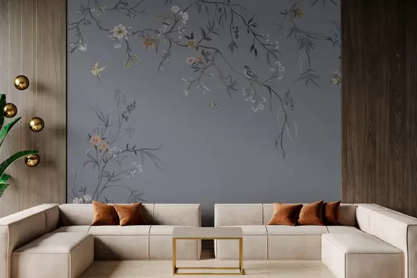 Fototapeten Blumenzweige mit Vögeln auf grünlichem Hintergrund N° w05127v5