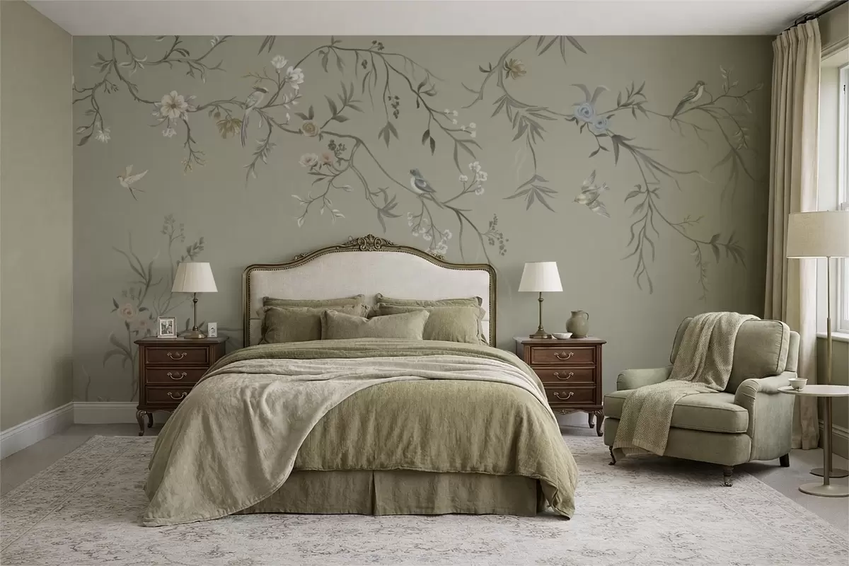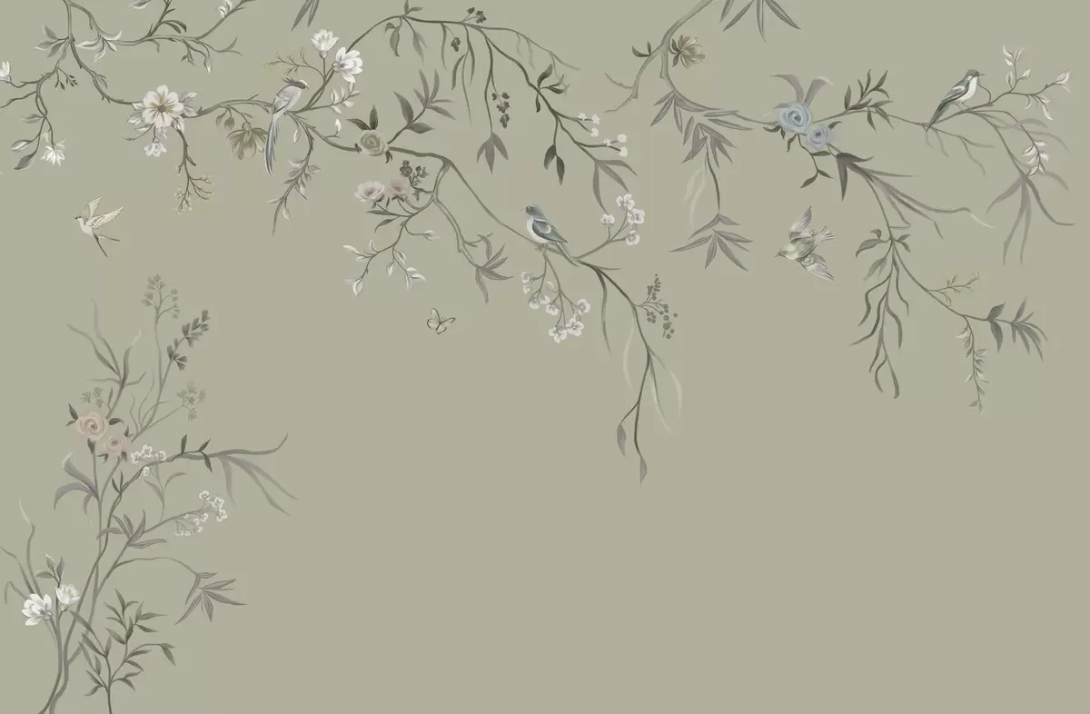 Fototapeten Blumenmuster mit Vögeln auf kühlem Hintergrund N° w05127v6
